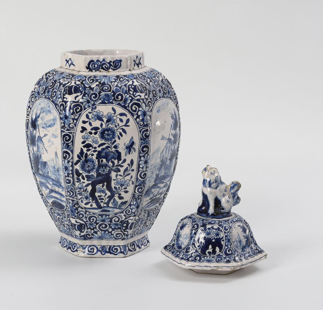 You are here:   Home Categories Ceramics Delft faience lidded vase with windmill landscapes and flowers