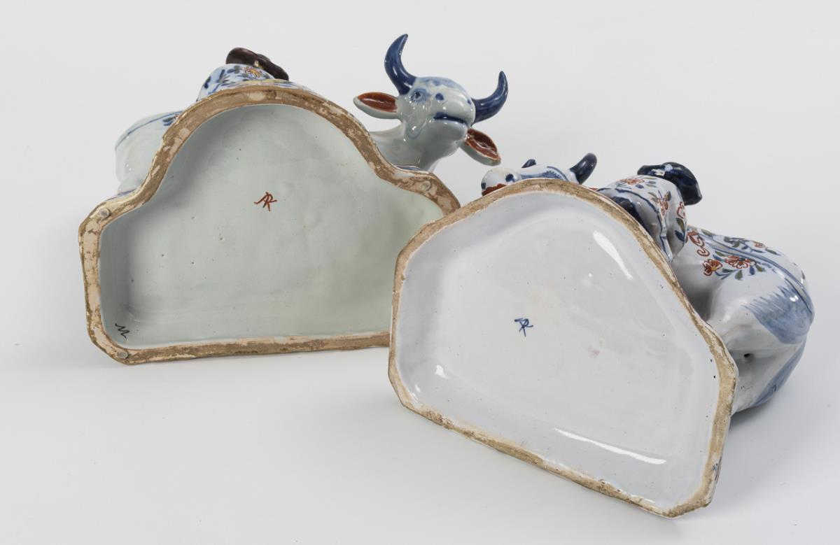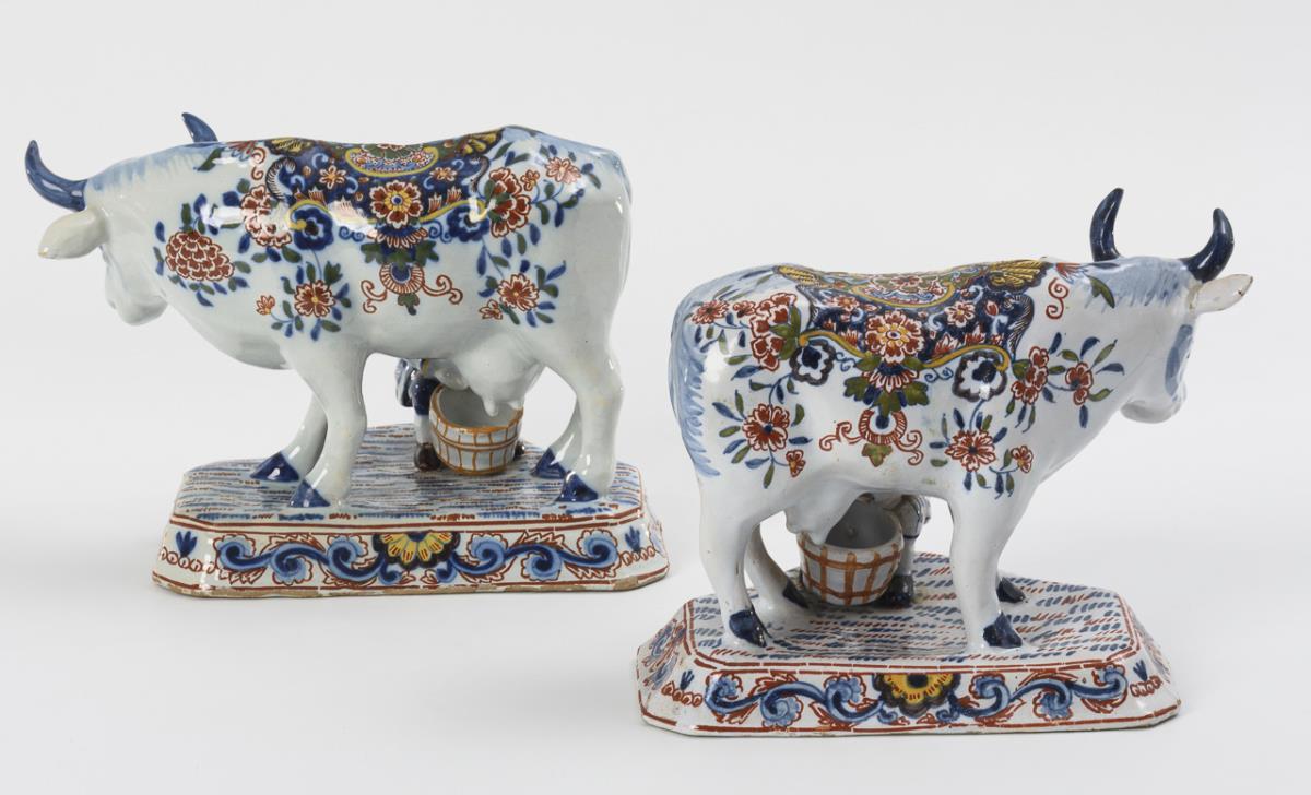 Pair of baroque Delft faience figurine groups: Cow with milking farmer.