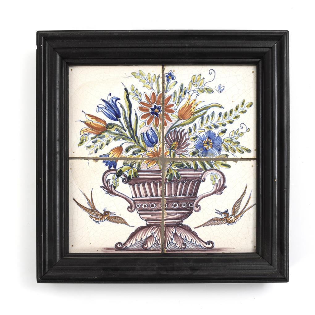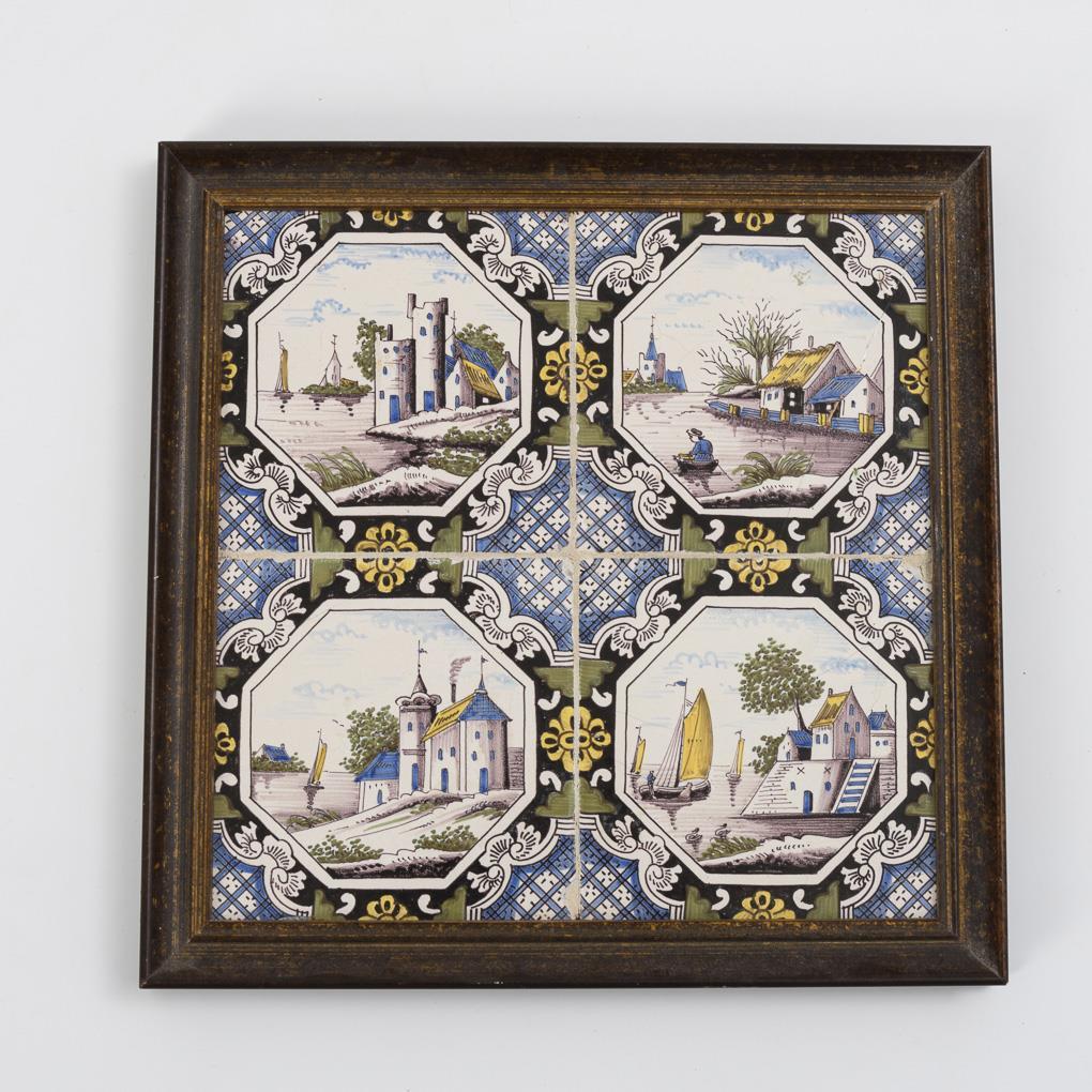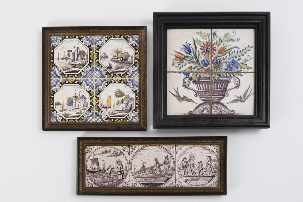 Landscape format with 3 tiles, depicting scenes of Christ in manganese violet (17 x 43.5 cm). Picture square with 4 different tiles, each with city architecture and boats on water (30.5 x 30.5 cm). 4-part tile picture with a magnificent bouquet of flowers and birds (33.5 x 33.5 cm). Each with wooden frame. With defects and signs of age.