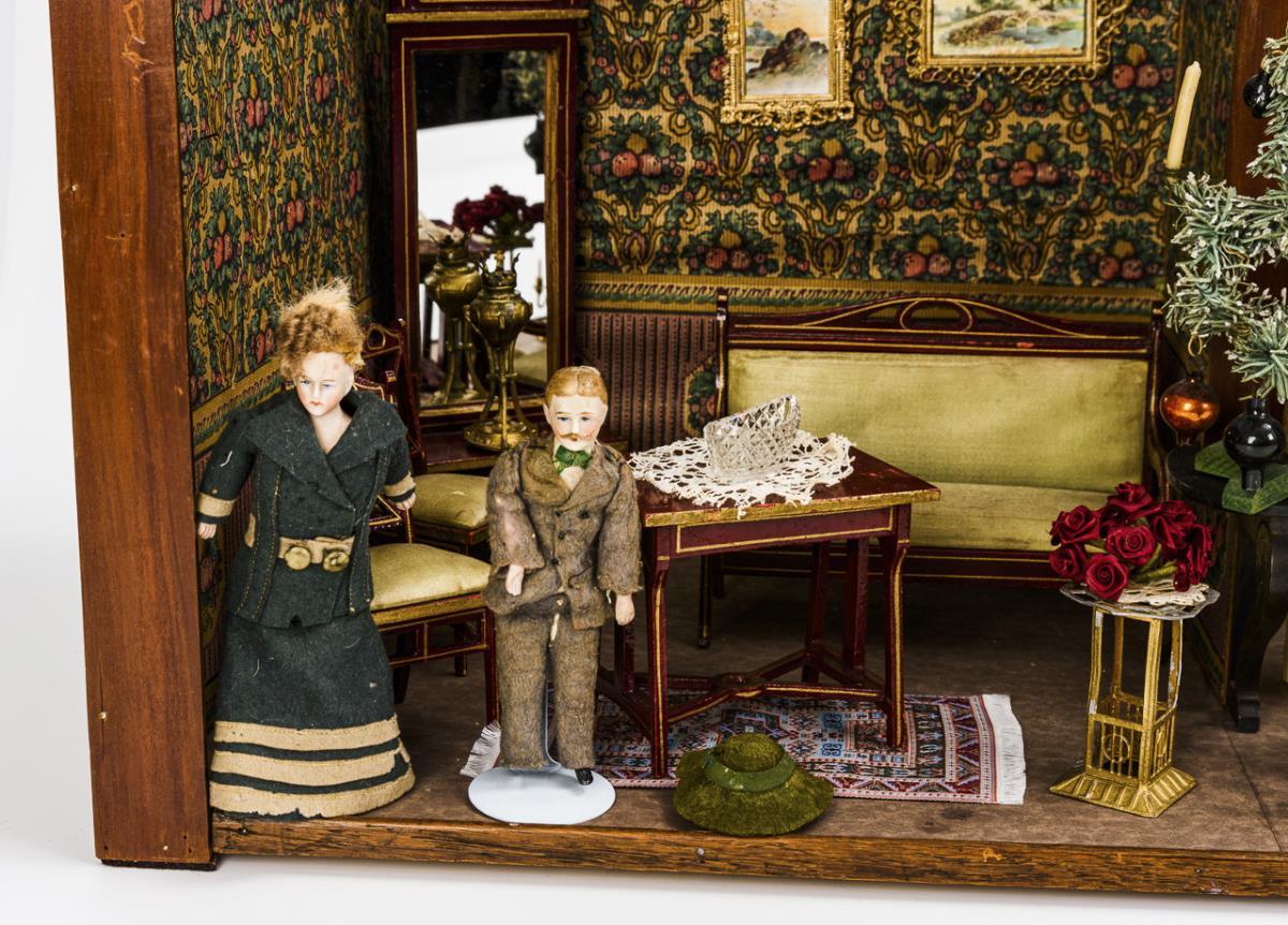 Trapezoidal case, with living room furnished as a drawing room with mahogany-colored furniture and Christmas trees and bedroom with white furniture in the style of the 1920s/30s. Comes with 3 defective doll's house dolls: originally dressed gentleman with moustache, lady in old sailor dress and all-biscuit doll. Signs of age and defects. Doll with severe defects: Arms, legs, feet partly missing.