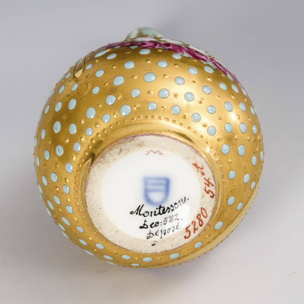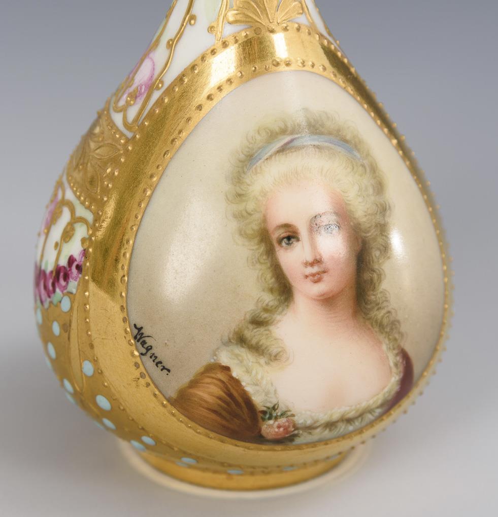 Pear vase with the portrait of Madame de Montesson painted on the front and inscribed on the underside, after a painting by Élisabeth Vigée Le Brun; verso floral and relief gold painting and turquoise jewel painting. Mouth rim restored/retouched.