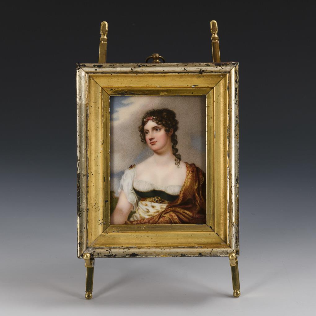 With small easel as stand. Rectangular small picture plate with the depiction of a young woman in an Empire dress with cape. Bump to the lower edge of the picture.