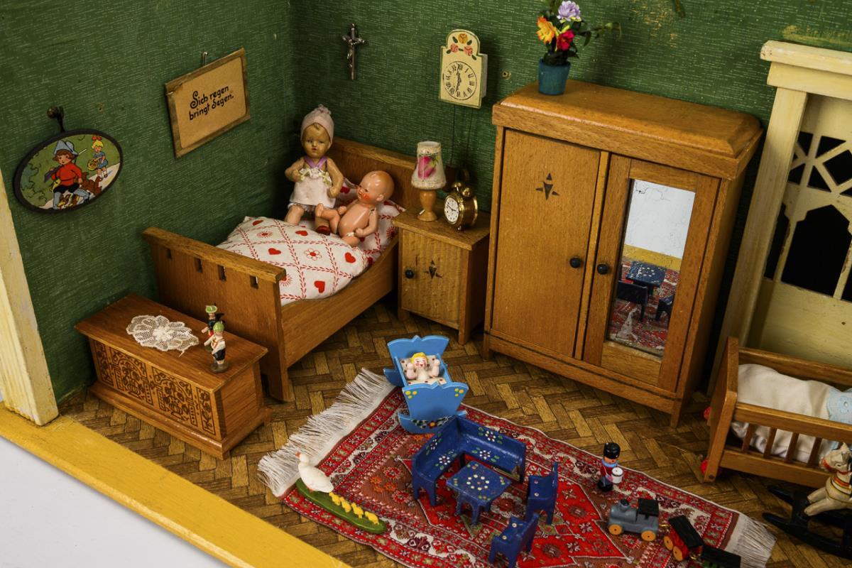 1-room cabinet with bay window and sliding door. Furnished as a bedroom with beechwood furniture: single bed, crib, bedside cabinet, closet, chest of drawers with mirror and some accessories. Including 3 mass dolls. Worn, signs of age, small defects.