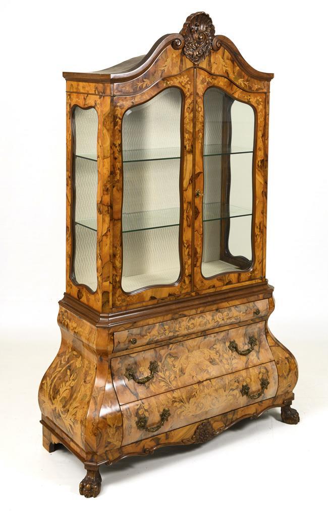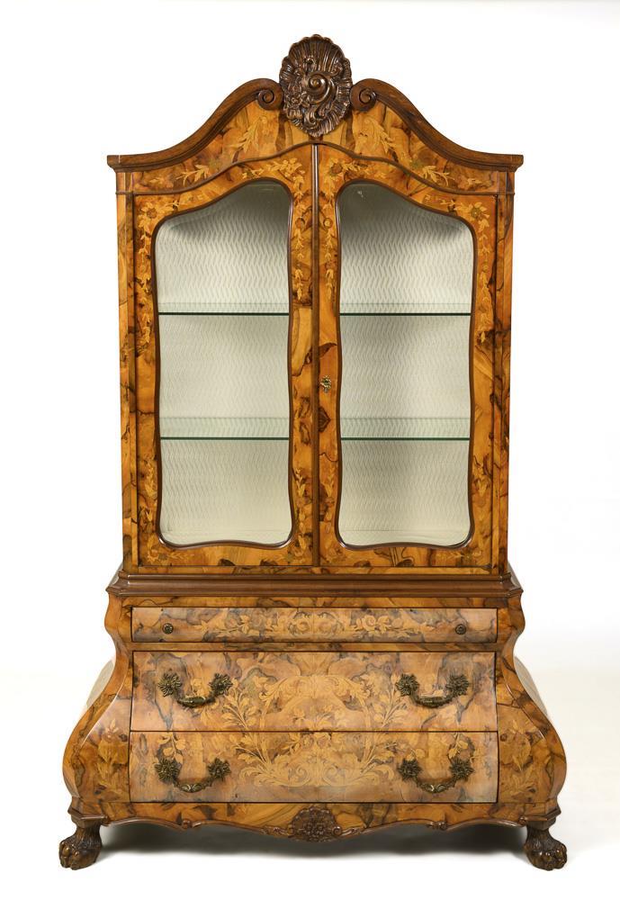 Cabinet in strikingly curved form with 2-door, 3-sided glazed top and 3-tier chest of drawers, on "claw-and-ball" feet typical of the style; decorated with burl veneer and floral bronze fittings. Veneer with traces of cleaning.