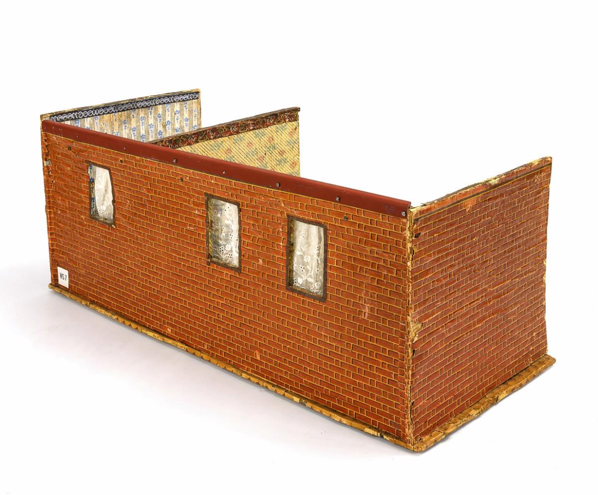 Paperboard/cardboard exterior with brick-look wallpaper, patterned wallpaper interior. Parquet-look flooring. 25 x 63 x 26.5 cm.