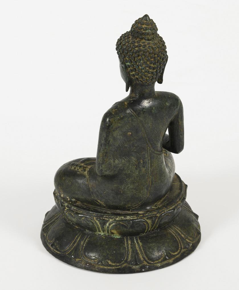 Figure seated on a double lotus base with the mudra of meditation and offering. Between his legs a snake in relief(?).