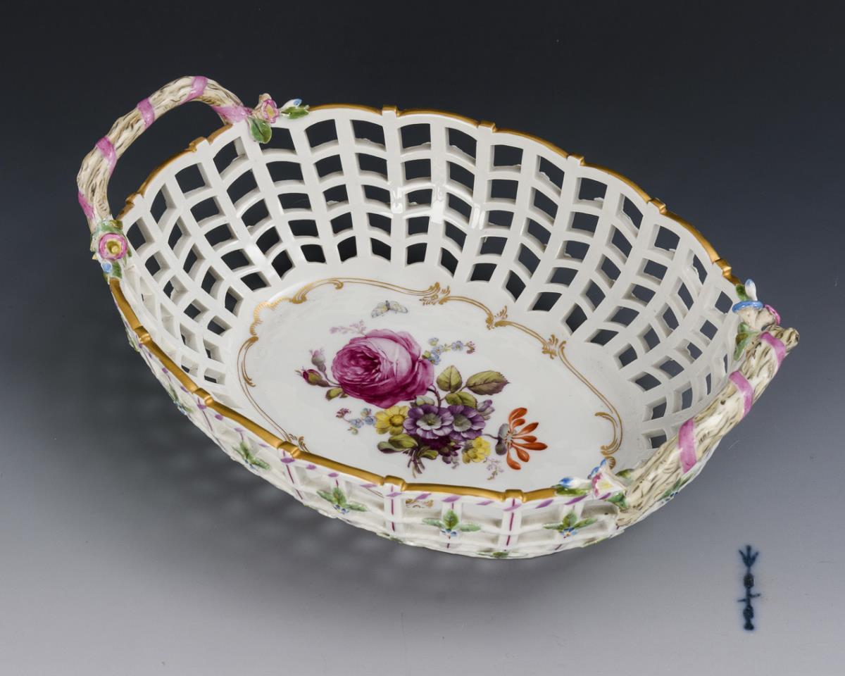 Oval basket with lattice opening, two branch handles and a bouquet of flowers in the mirror. Bumps to the flowers, hairline crack in 1 handle.