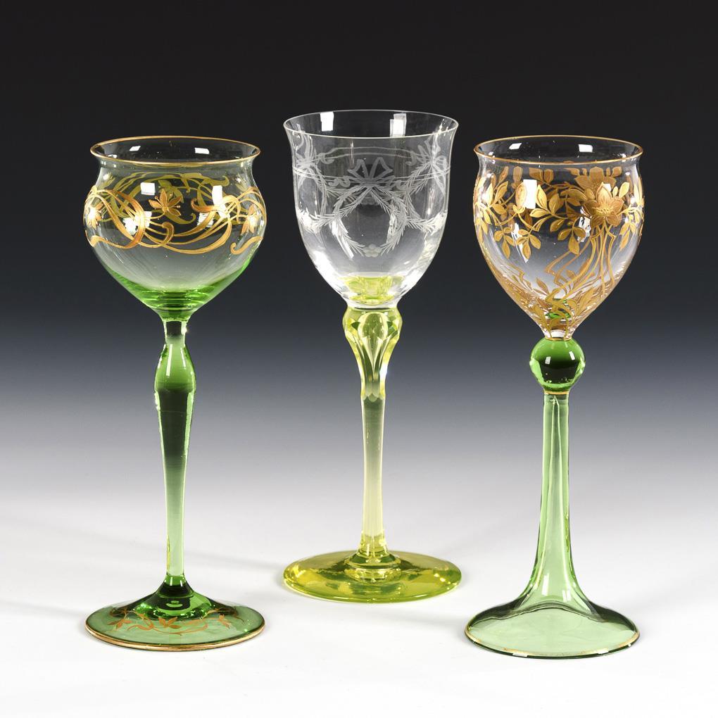 1x rare wine glass, probably Josephinenhütte, from the environment of the designs by Siegfried Haertl (1870-1940): longitudinally optically blown bowl of colorless glass with engraved wreaths and festoons, stem and round base of eleonora yellow uranium glass with air bubble in the honeycomb-facetted nodus / 2x JOSEPHINENHÜTTE, shape no. 1341, decor Camillo de Maess (1845-1927), painting Hanney workshop : 1x with floral polished and relief gold painting on the dome of colorless glass, trumpet hollow stem of green glass with spherical mode; 1x polished and relief gold painted floral tendrils in Art Nouveau style on the dome of colorless glass, slender baluster stem of green glass, round foot. 1x minimal gold abrasion on the foot.