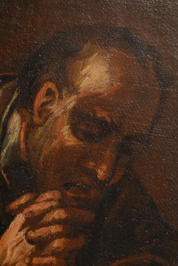 Saint embracing a cross and man praying in supplication before the crucifix. Each canvas relined.