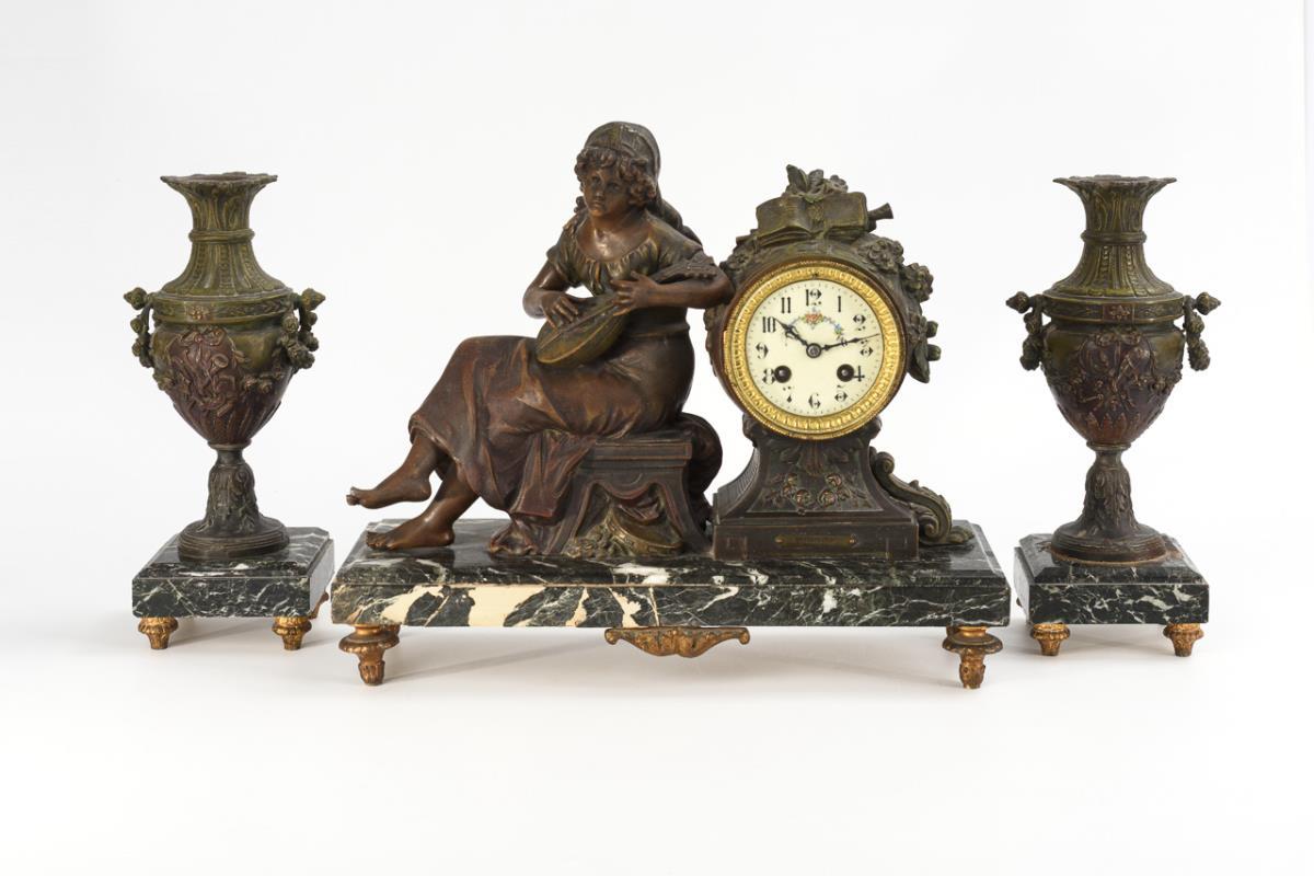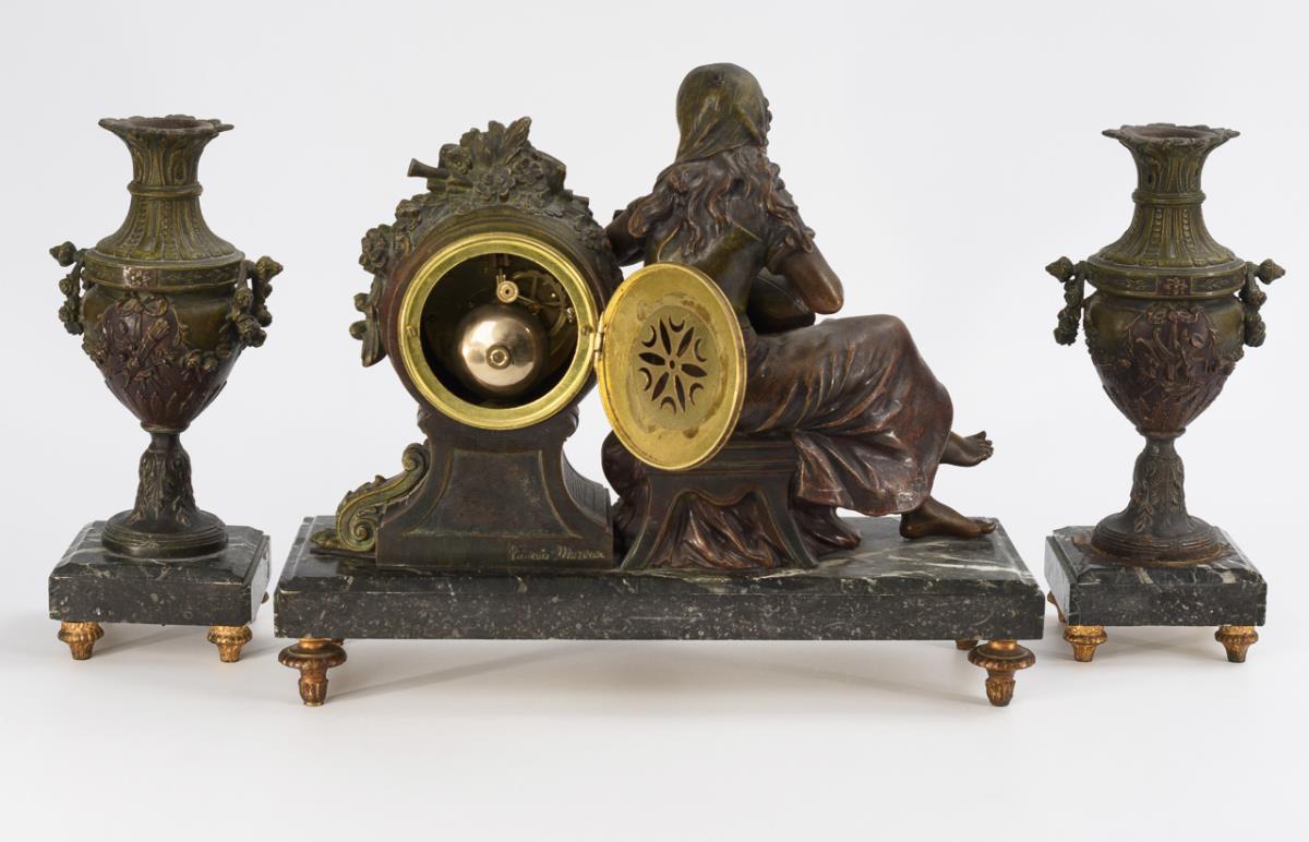Green-black-white marble, bronzed cast metal. Clock H 34 cm, L 40 cm, 9.3 kg. Side plates H 30 cm, 1.8 kg each.