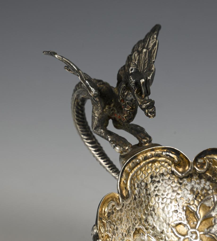 Oval silver bowl with dragon handles.
