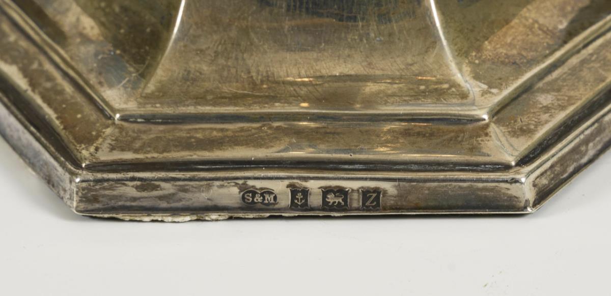 2 English silver candlesticks (Birmingham 1974) with faceted baluster stem, h 18 cm each. Trumpet-shaped vase (Gottlieb Kurz, Schwäbisch Gmünd), h 13 cm. Traces of use.