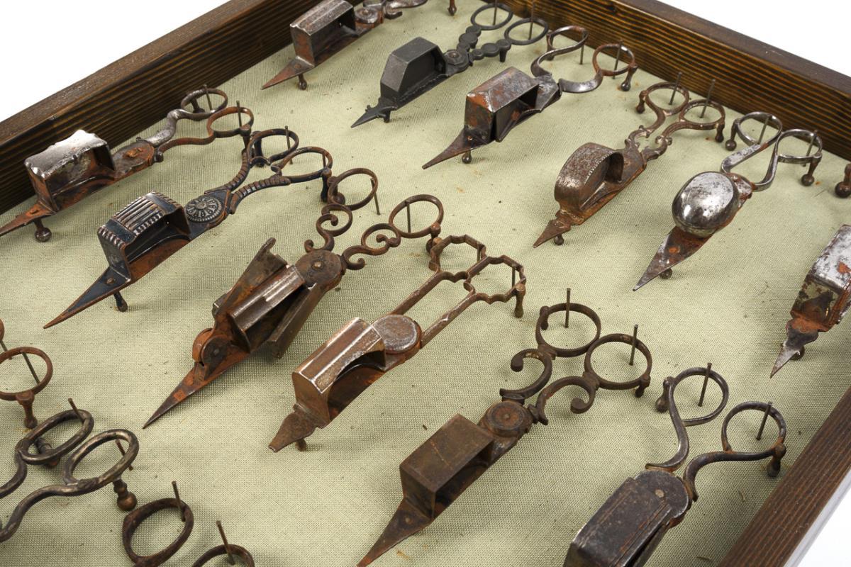 Iron partly nickel-plated (1x silver-plated), 3x brass, 1x pewter, 1x copper with remnants of silver-plating, 1x silver. L maximum 17 cm, silver wick scissors L 6 cm. Box 61 x 43 x 6 cm.
