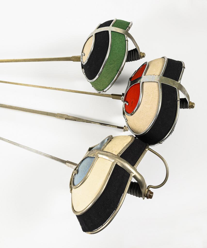 Felt-covered baskets with colors: black-white-red, green-black-white or black-white-blue. Grips each covered with ray skin. Each with marked burr blades with cut-off points. / Unmarked, chrome-plated replacement blade with a central point without a cut point and screw nut. Some heavy signs of age/use.