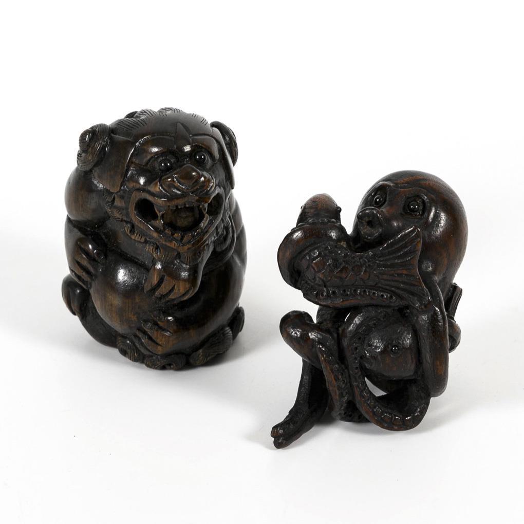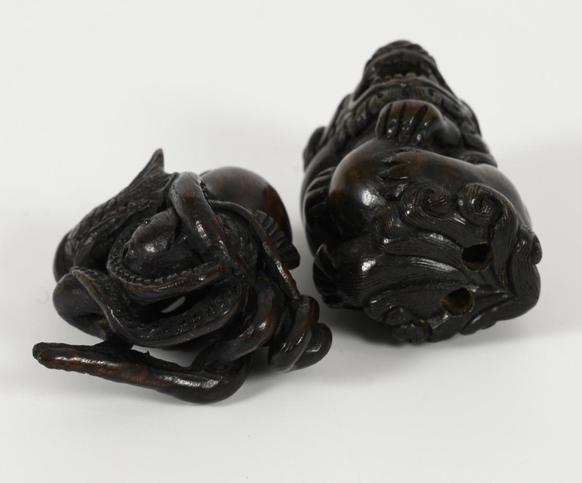 Octopus with two fish in its arms. Dark wood, with glass eyes, h 4 cm. / Mythical creature with movable ball in its mouth. Signed, dark wood, with glass eyes. H 4 cm.