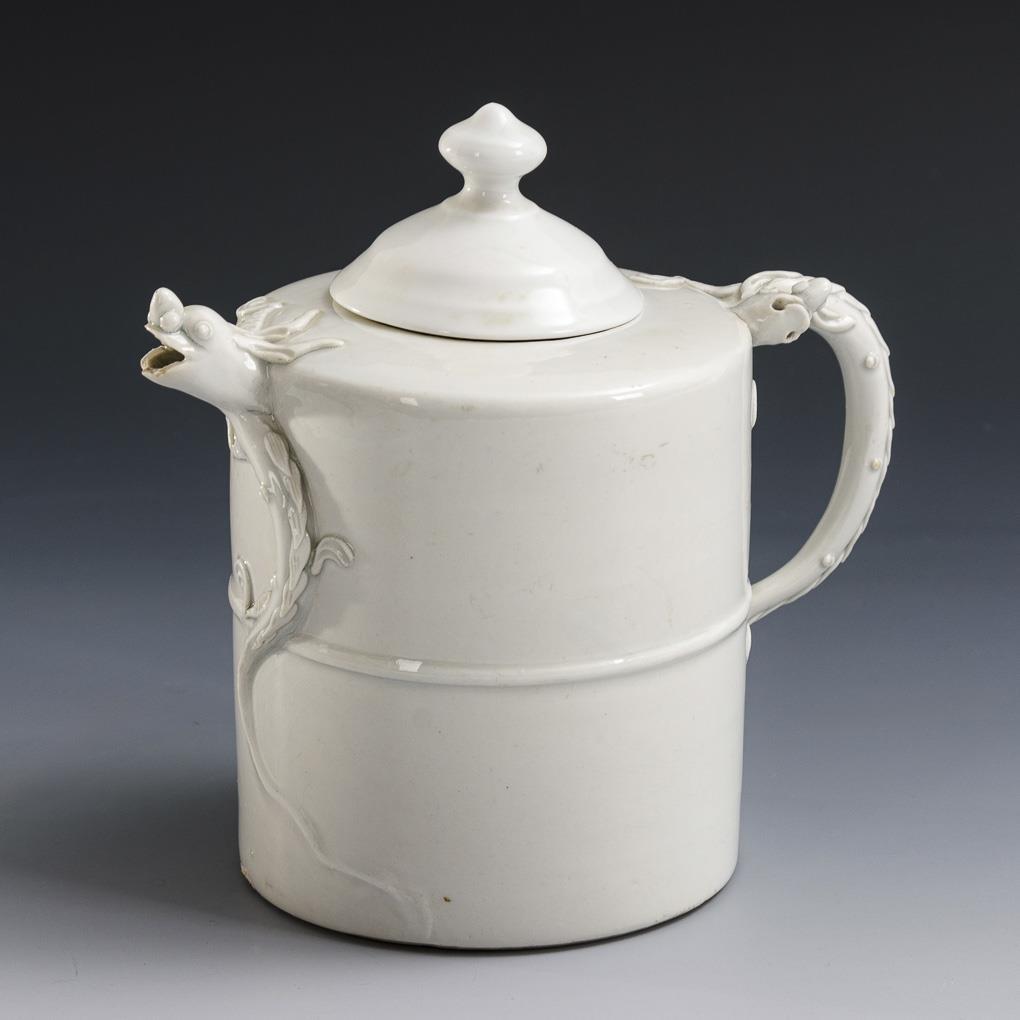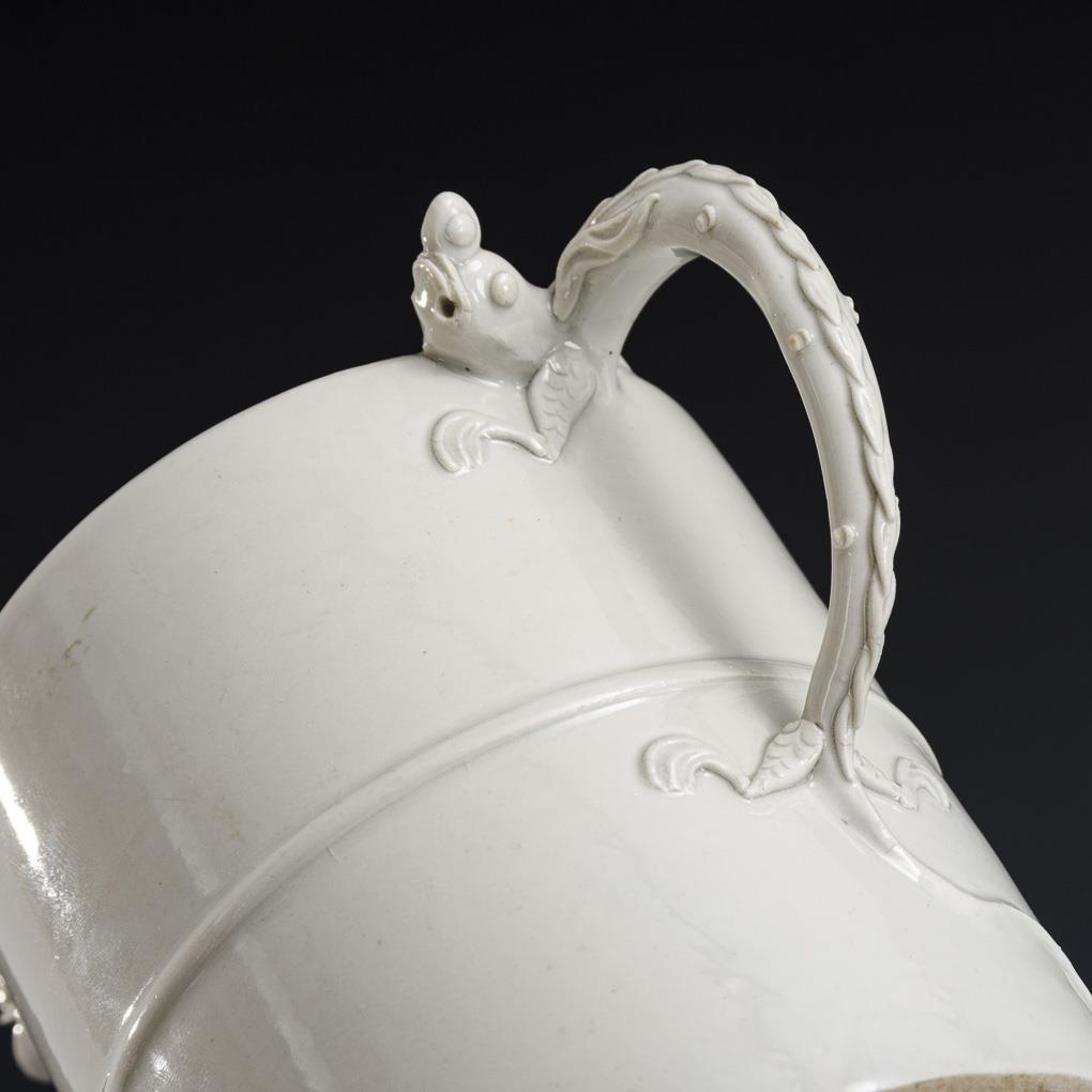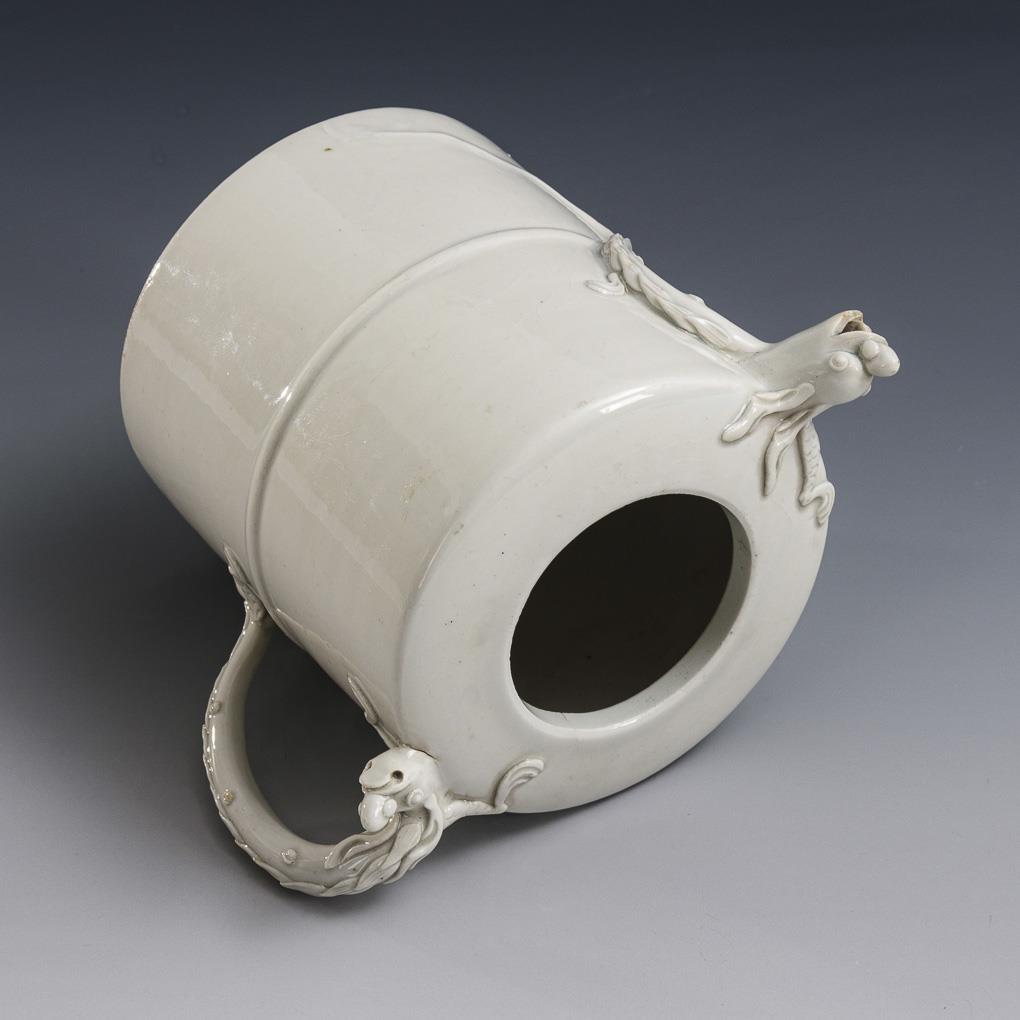 Cylindrical jug with a finely molded handle in the shape of a lizard. Lid replaced, snout chipped.