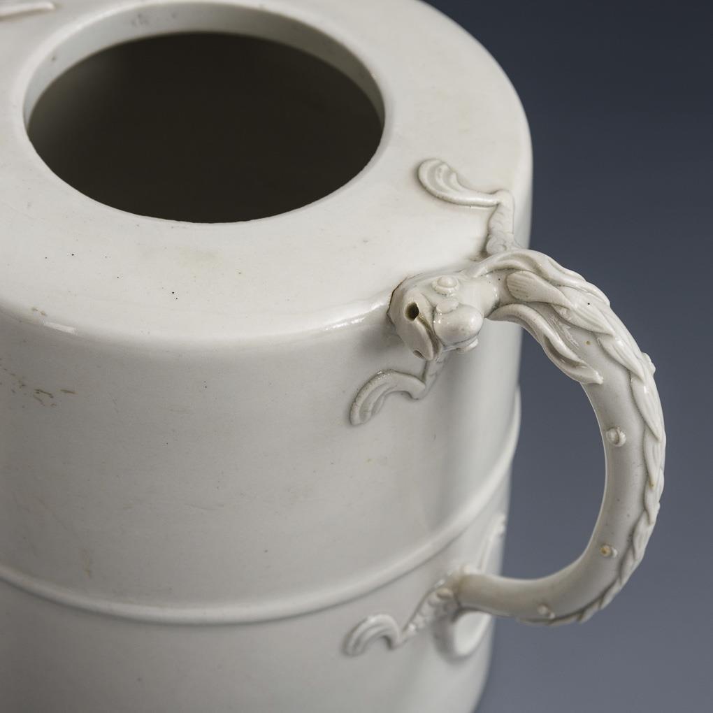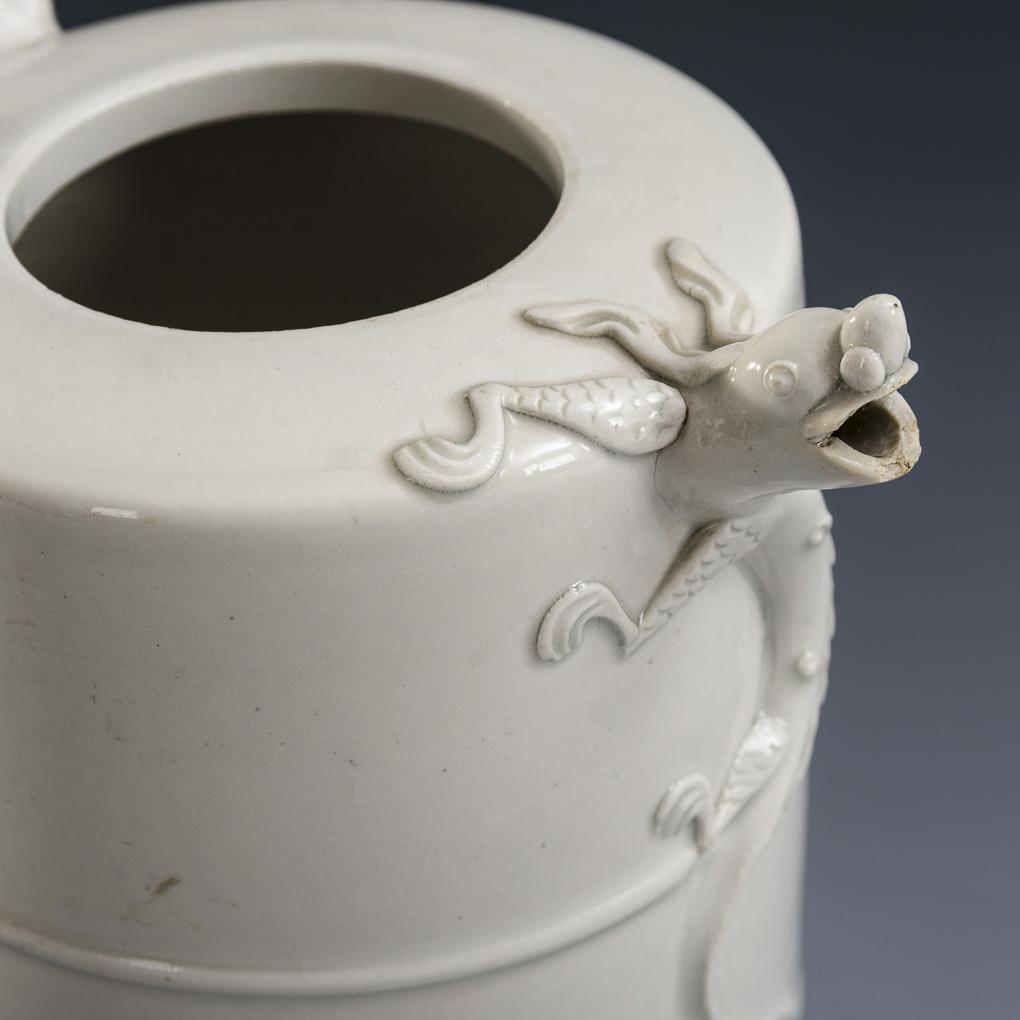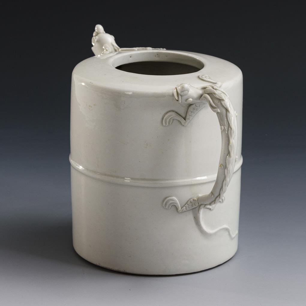 Cylindrical jug with a finely molded handle in the shape of a lizard. Lid replaced, snout chipped.