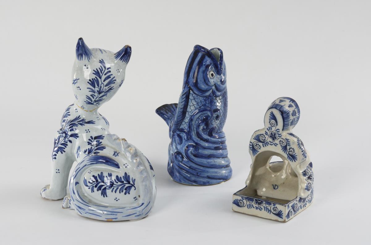 3 Delft faience figurines: cat, fish and woman.