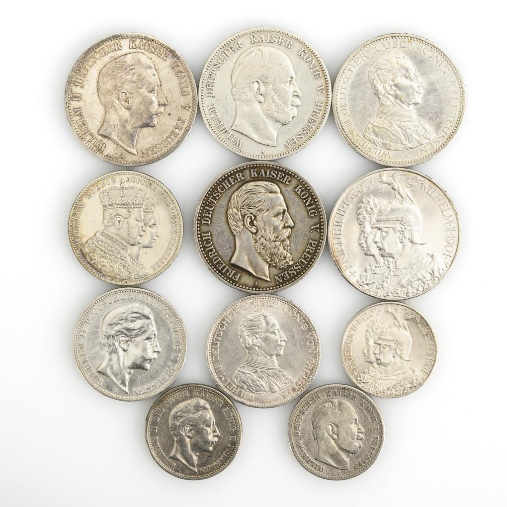 Coronation thaler 1861, Wilhelm Koenig Augusta Koenigin v .Preussen. / 2 and 5 Marks ( each 1876) Wilhelm German Emperor King of Prussia. / 5 Mark 1888 Frederick German Emperor King of Prussia. / 2 commemorative coins 200 years of the Kingdom of Prussia: 5 or 2 marks Frederick I. 1701 William II. 1901 / 5 or 3 or 2 marks (1907, 1910, 1907) William II. German Emperor King of Prussia. / 5 resp. 3 Marks (each 1914) Wilhelm II German Emperor King of Prussia. Condition: Very nice.