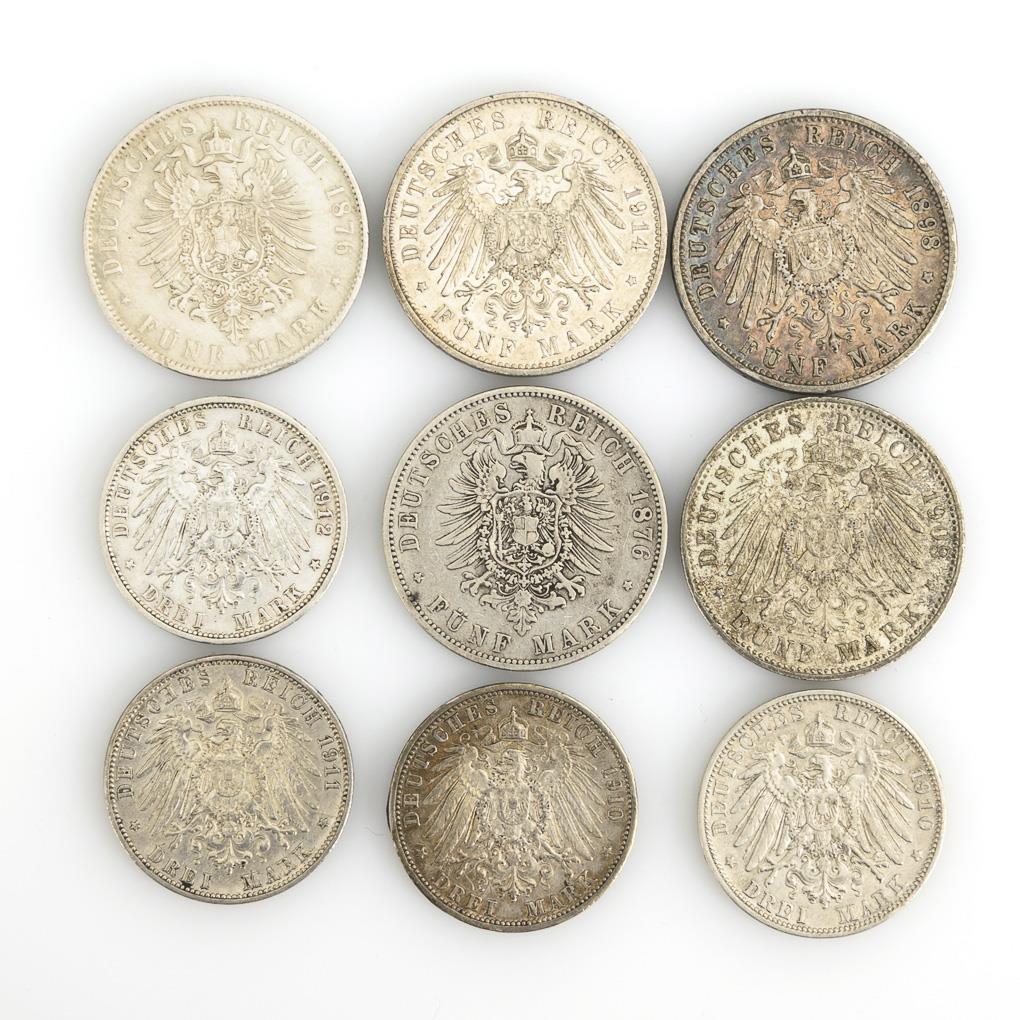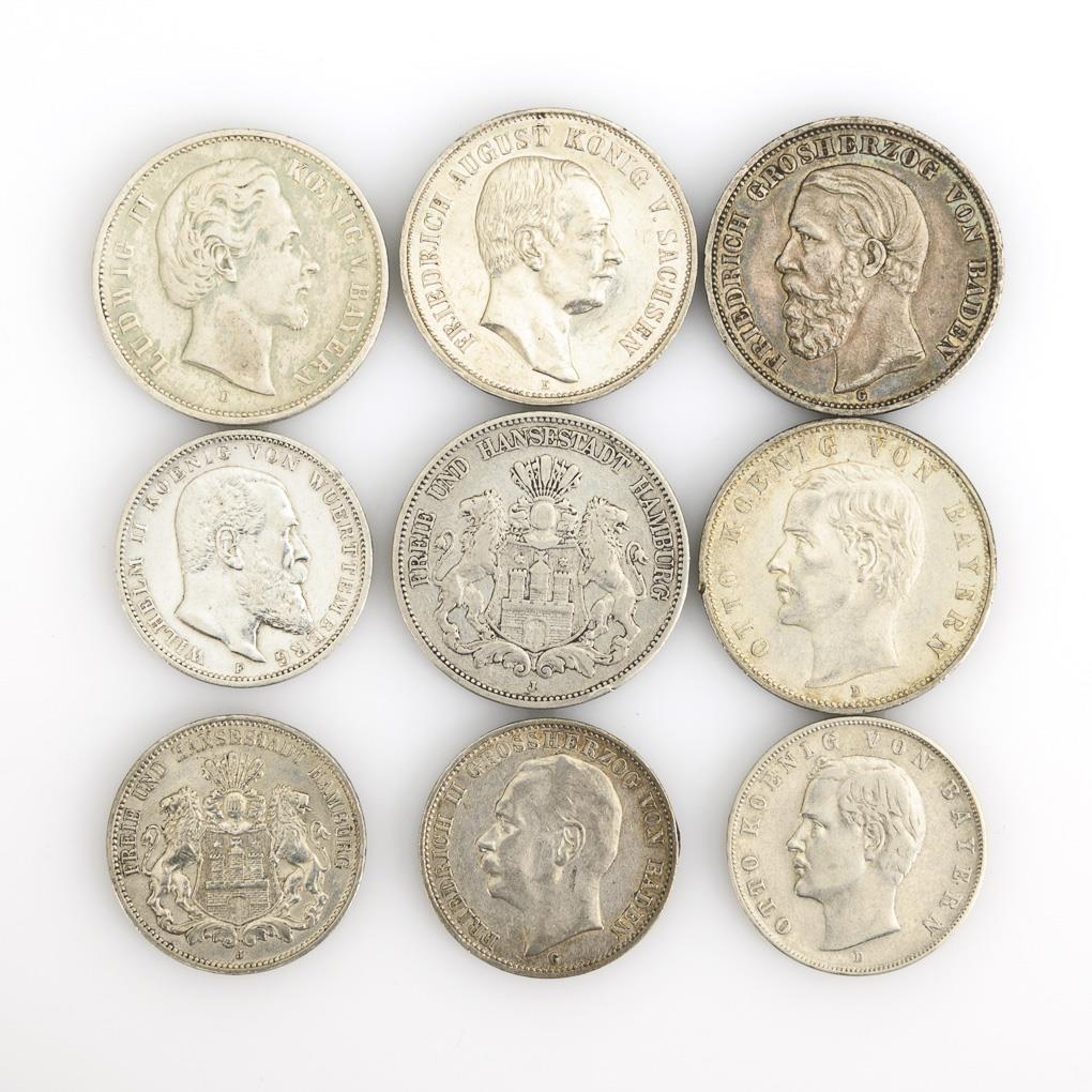 2x 5 Marks 1876 Hamburg and Ludwig II King of Bavaria / 3 Marks 1898 Friedrich Grand Duke of Baden. / 5 Mark 1908 Otto Koenig von Bayern / 2x 3 Mark Otto Koenig von Bayern or Frederick Grand Duke of Baden. / 3 Mark 1911 Hamburg. / 3 Mark 1912 Wilhelm II King of Wuerttemberg. / 5 Mark 1914 Friedrich August King of Saxony. Condition: very fine, 1x with minor edge damage.