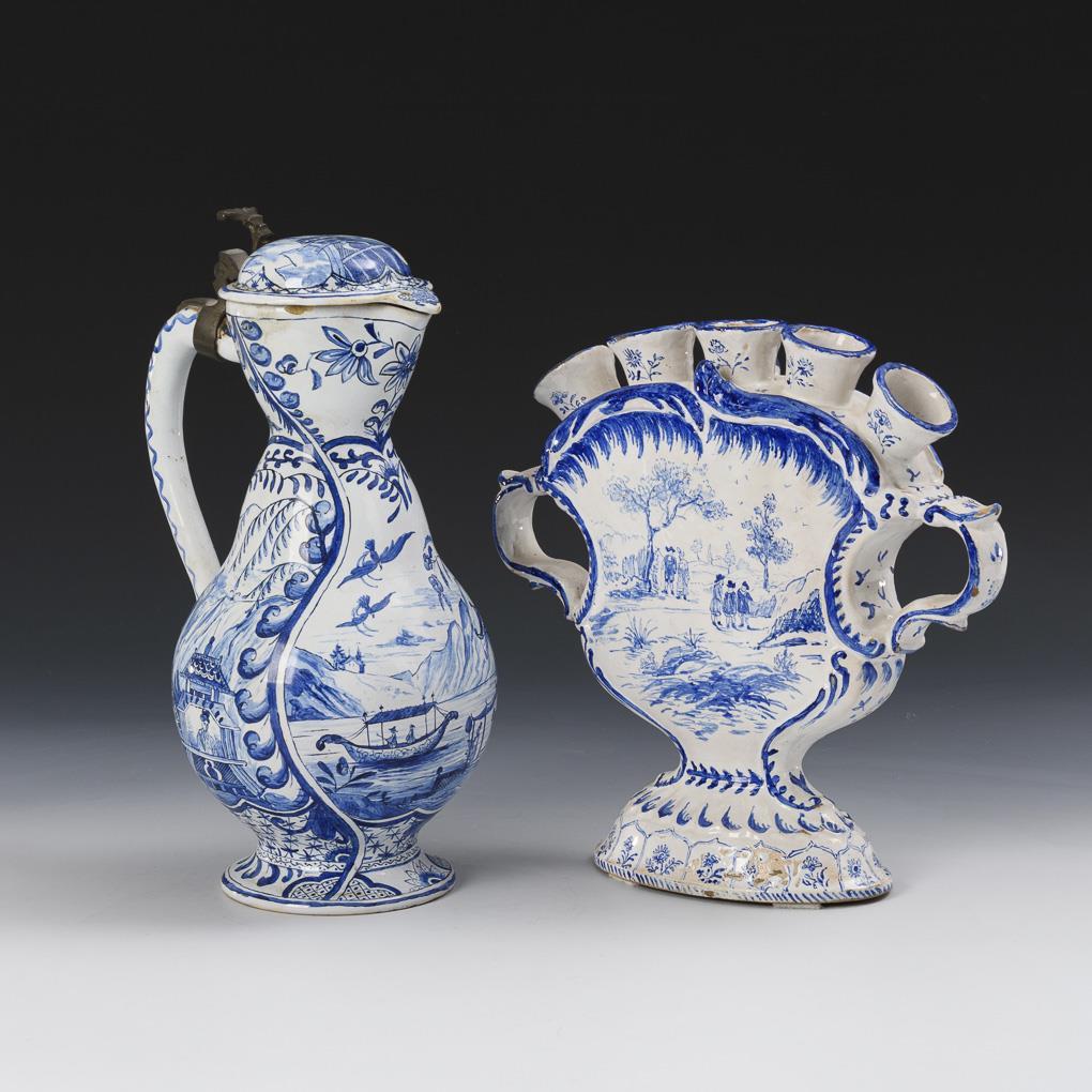 Ovoid jug with stepped stand and volute handle, faience lid with pewter pusher, painted with Asianized landscapes and staffage (h 28.5 cm). 5-turn flower vase with rocaillé wall, side handles and offset stand, painted with a city view and groups of figures in a landscape (H 24.5 cm). Defects to the glaze and rims.