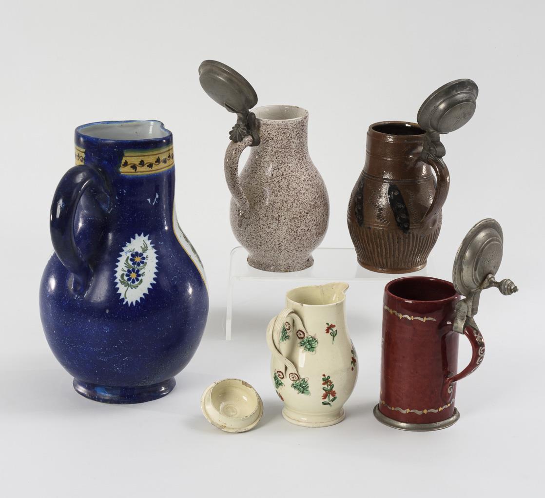Large Biedermeier jug with lady, Hanau pear jug with sponged walls, Muskau jug with incised and stamped decoration, small cylinder jug with red glaze and South German coat of arms in gold, small Biedermeier jug with twisted handle and flower painting. Partly with pewter lid. Parts with defects, large jug restored.