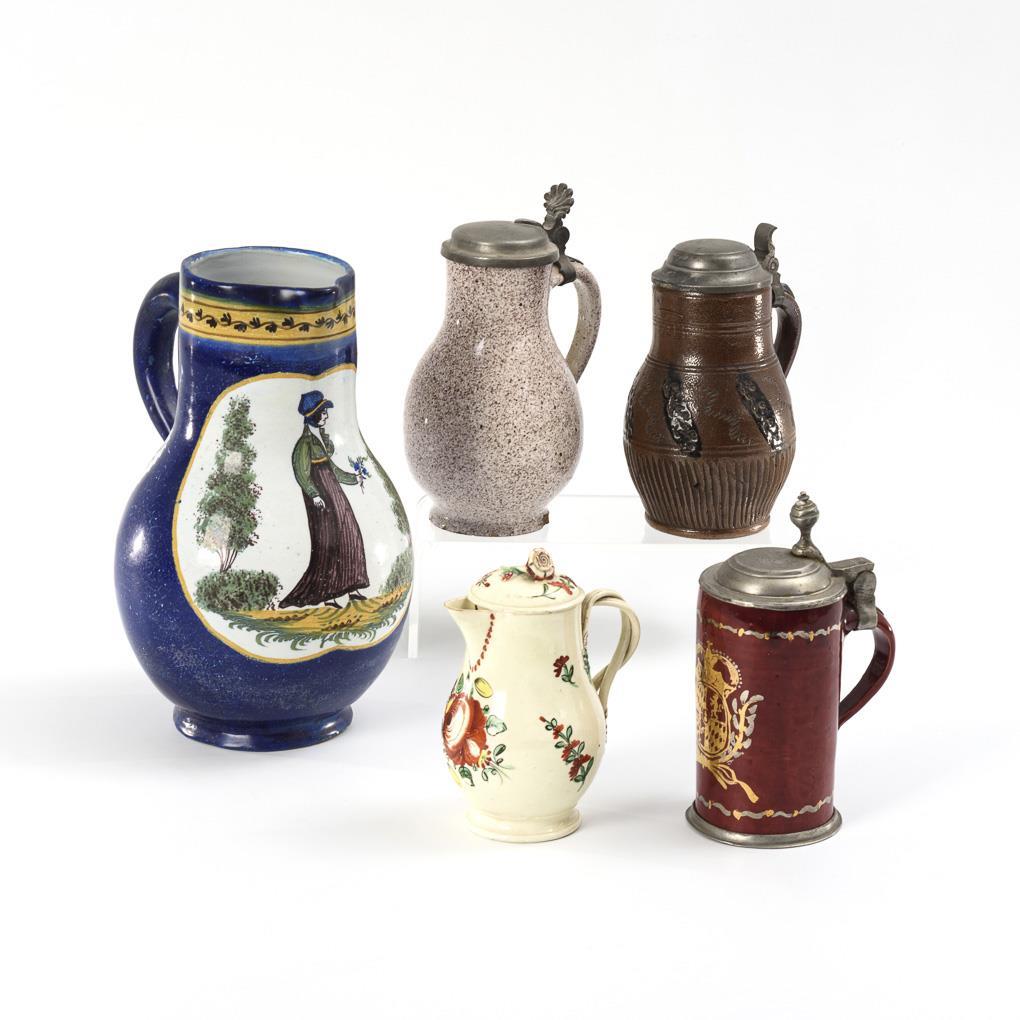 Large Biedermeier jug with lady, Hanau pear jug with sponged walls, Muskau jug with incised and stamped decoration, small cylinder jug with red glaze and South German coat of arms in gold, small Biedermeier jug with twisted handle and flower painting. Partly with pewter lid. Parts with defects, large jug restored.