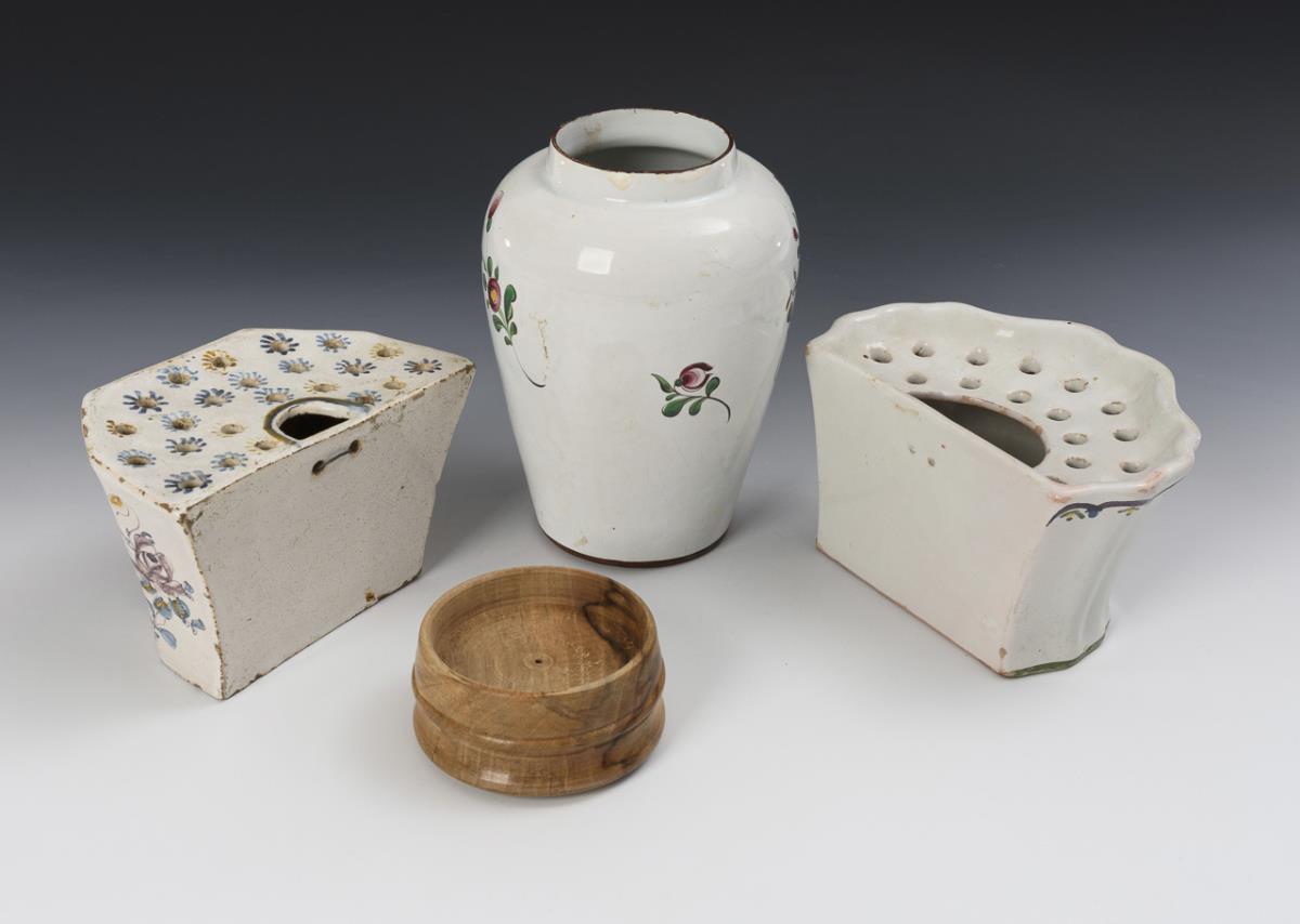 Baluster vessel with flower painting, turned wooden lid (h 24 cm). 2 plug-in vases for the wall, 1x ribbed wall with figure painting, 1x beveled corners (h approx. 10.5 cm). Round plate with grapes (Ø 22 cm). Slight signs of age and wear, partial defects, tobacco pot restored on rim.