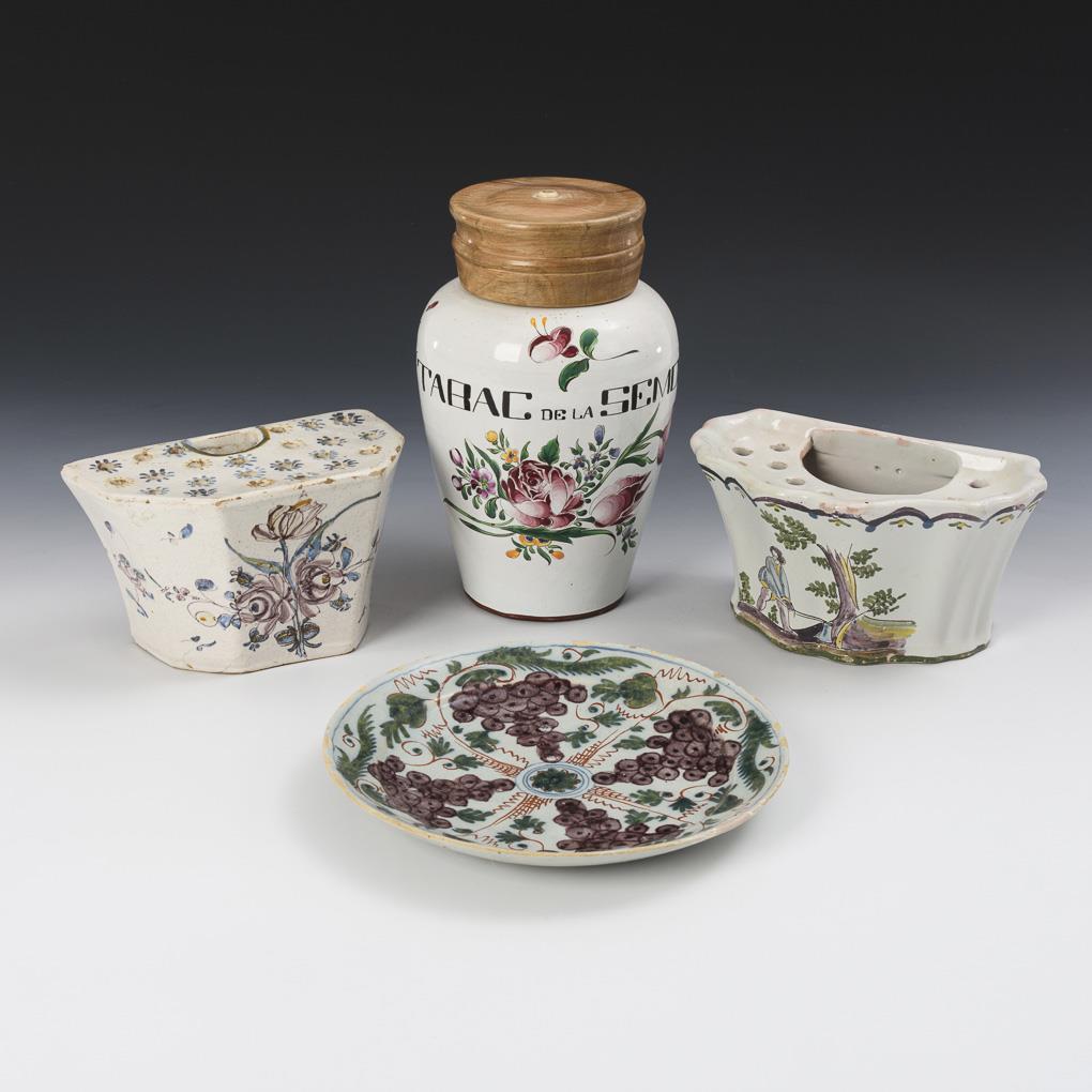 4 faiences: tobacco pot with wooden lid, 2 flower wall containers, plate with fruit.