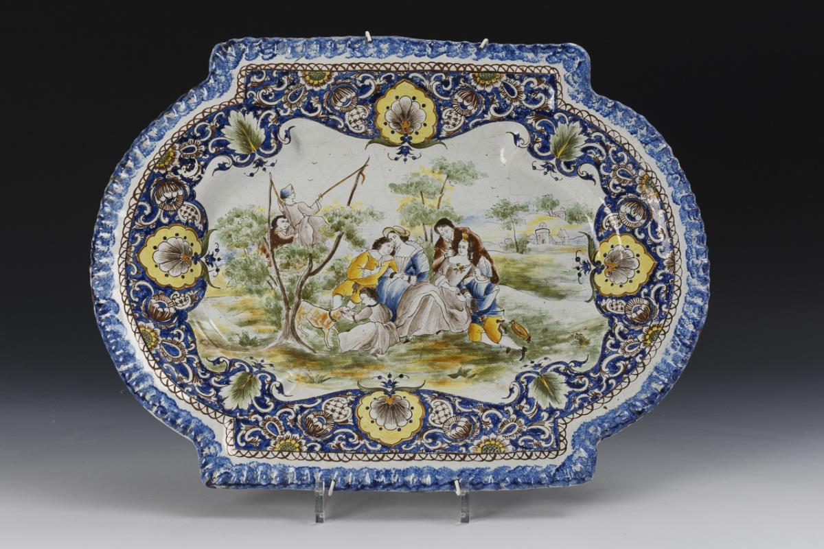 Oval platter in the shape of a baroque reserve, ribbed rim and curved molded. In the mirror an idyllic landscape with a historicizing party. With suspension. Rims and glaze slightly chipped.