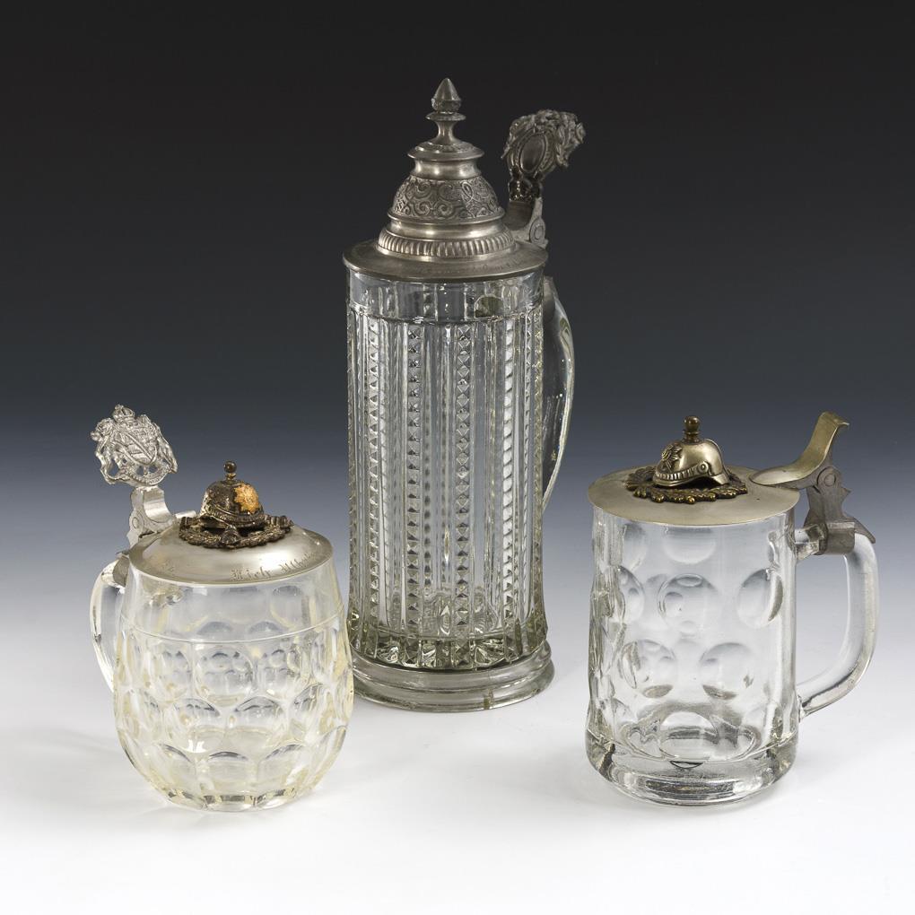 Cylindrical jug with "stoned" walls, pewter lid with engraved dedication "in memory of the 1860 campaign of the municipality of Oberndorf 1895". / Small jugs with lenses, pewter hinges and each metal lid with applied cannoneer's pickaxe caps and Saxon coat of arms; 1x engraved "4/64 Rich. Ulbrich 1907-09".