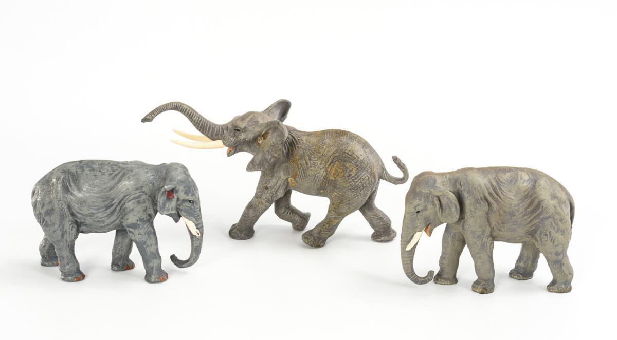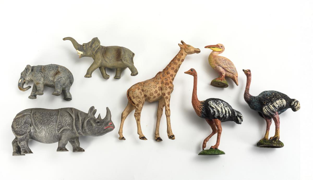 23 wild animals, including 5 elephants, 3 penguins, 2 ostriches, giraffe, rhinoceros, hippopotamus, dromedary etc. In addition 1 mass figure in uniform with bucket. Parts with small defects.