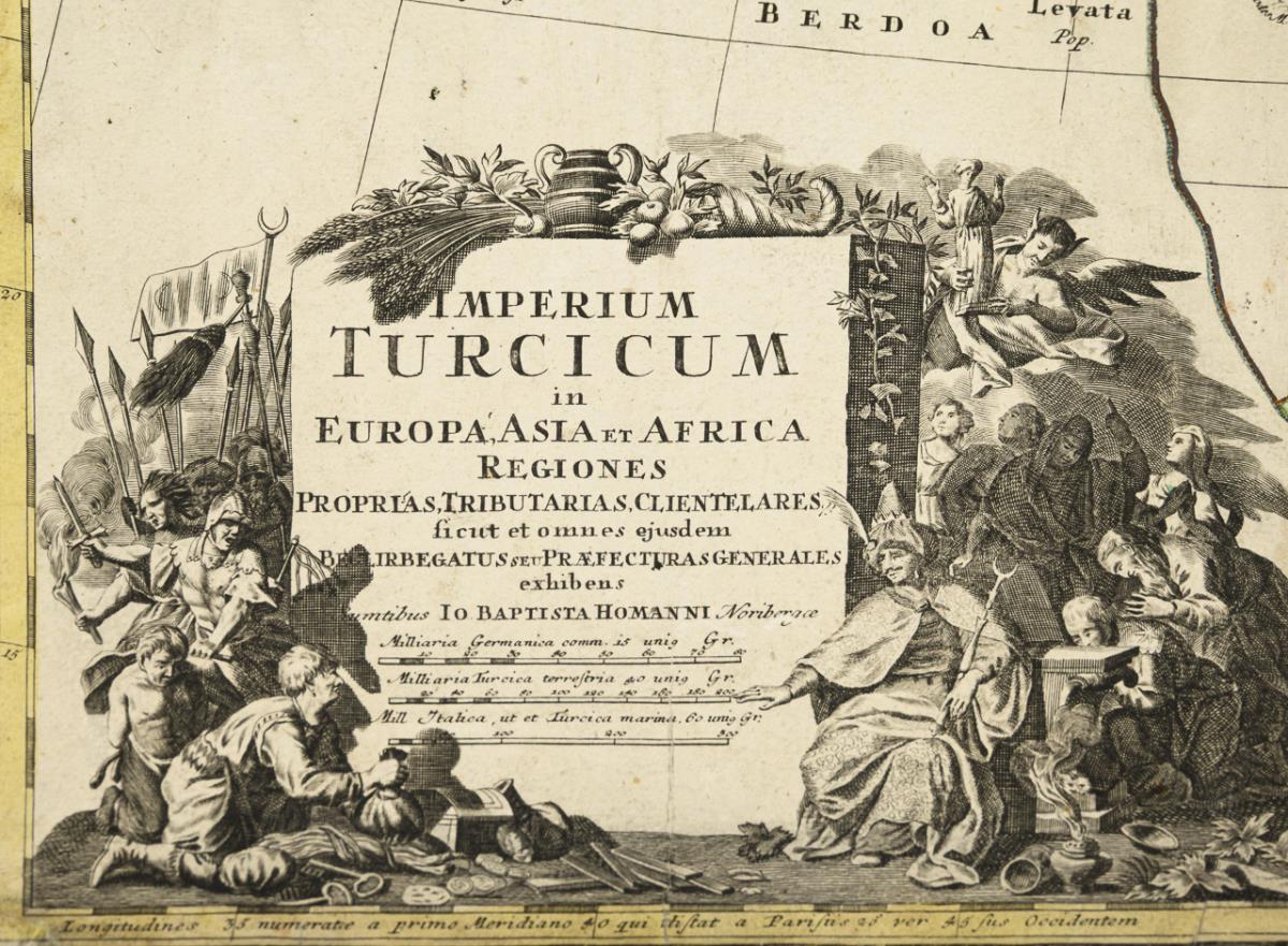 Detailed map of the Ottoman Empire with the Mediterranean, Black Sea and Caspian Sea, Greece, Turkey and the Arabian Peninsula, figurative title cartouche "Imperium Turcicum in Europa, Asia et Africa regiones", mileage marker. Marginal area restored, sheet with strong handling marks.