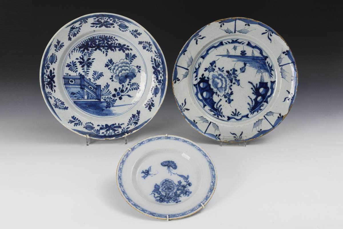 2 large plates (Ø 34 cm and 34.5 cm), 1 small plate with wall mount (Ø 23.5 cm). Rims chipped, glaze slightly rubbed, 1 plate with restored rim.