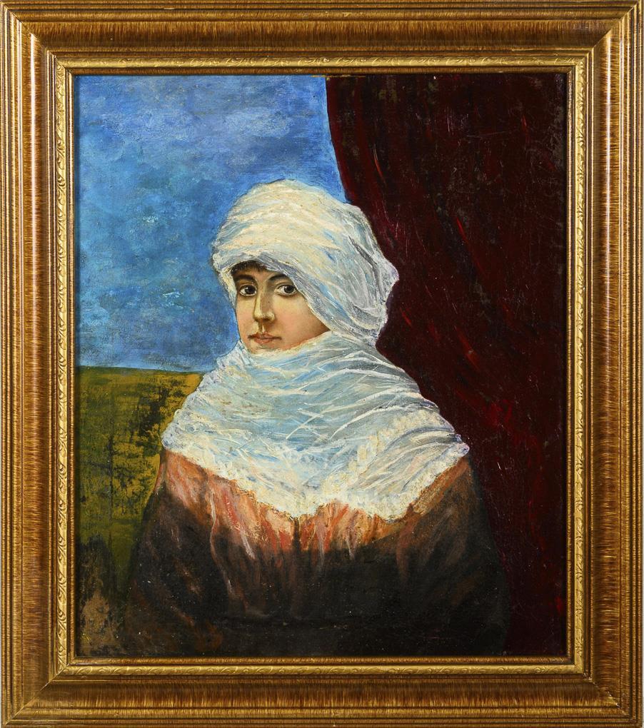 Portrait of a woman with a white scarf around her head in front of a barren landscape with a blue sky. One small restored area with backing, retouched.