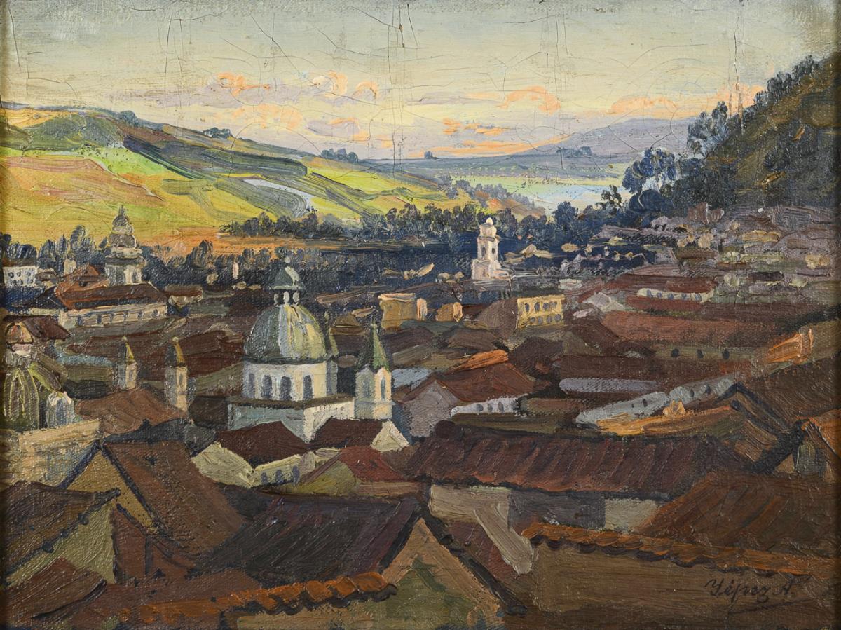 View over the roofs of the capital between the mountains under a blue sky. Slight traces of age.