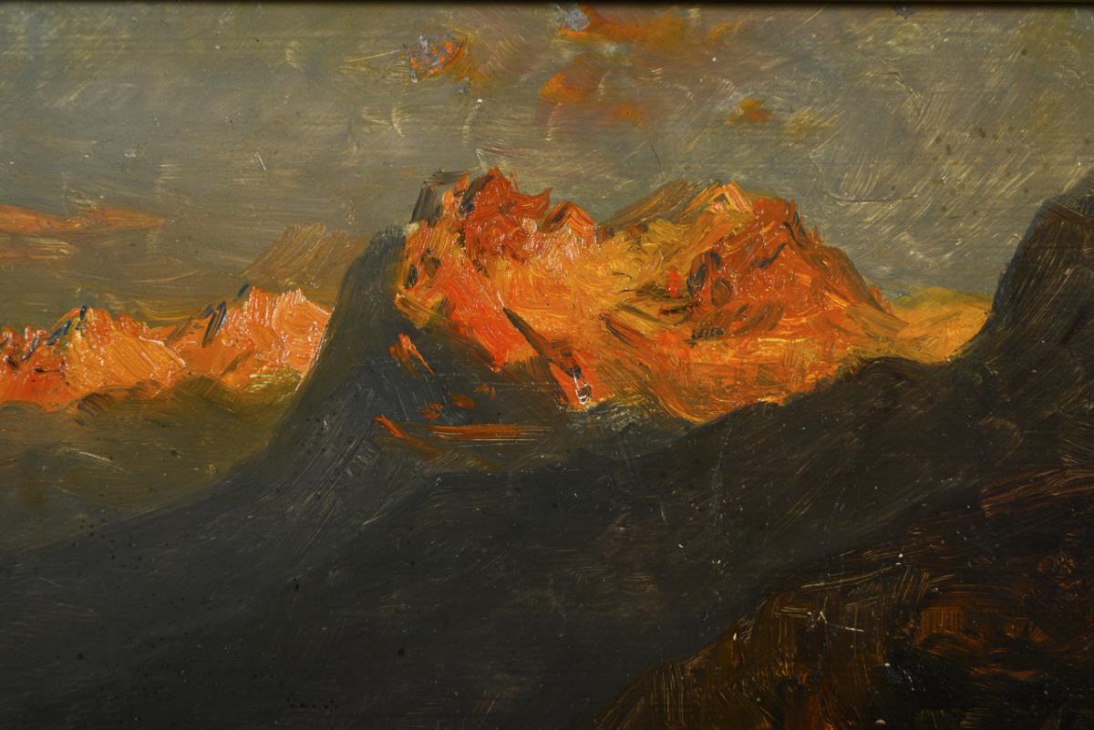 Staffage figure on a fence between trees and sailors on the alpine lake in front of the mountains with glowing peaks.