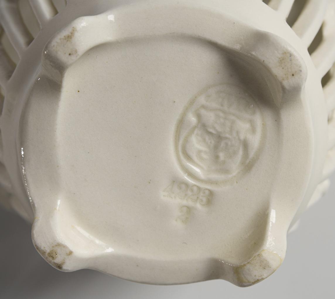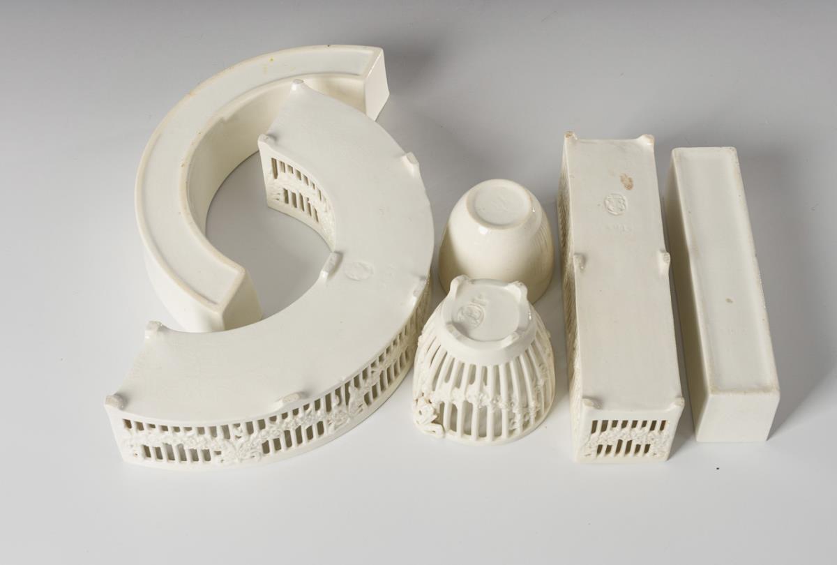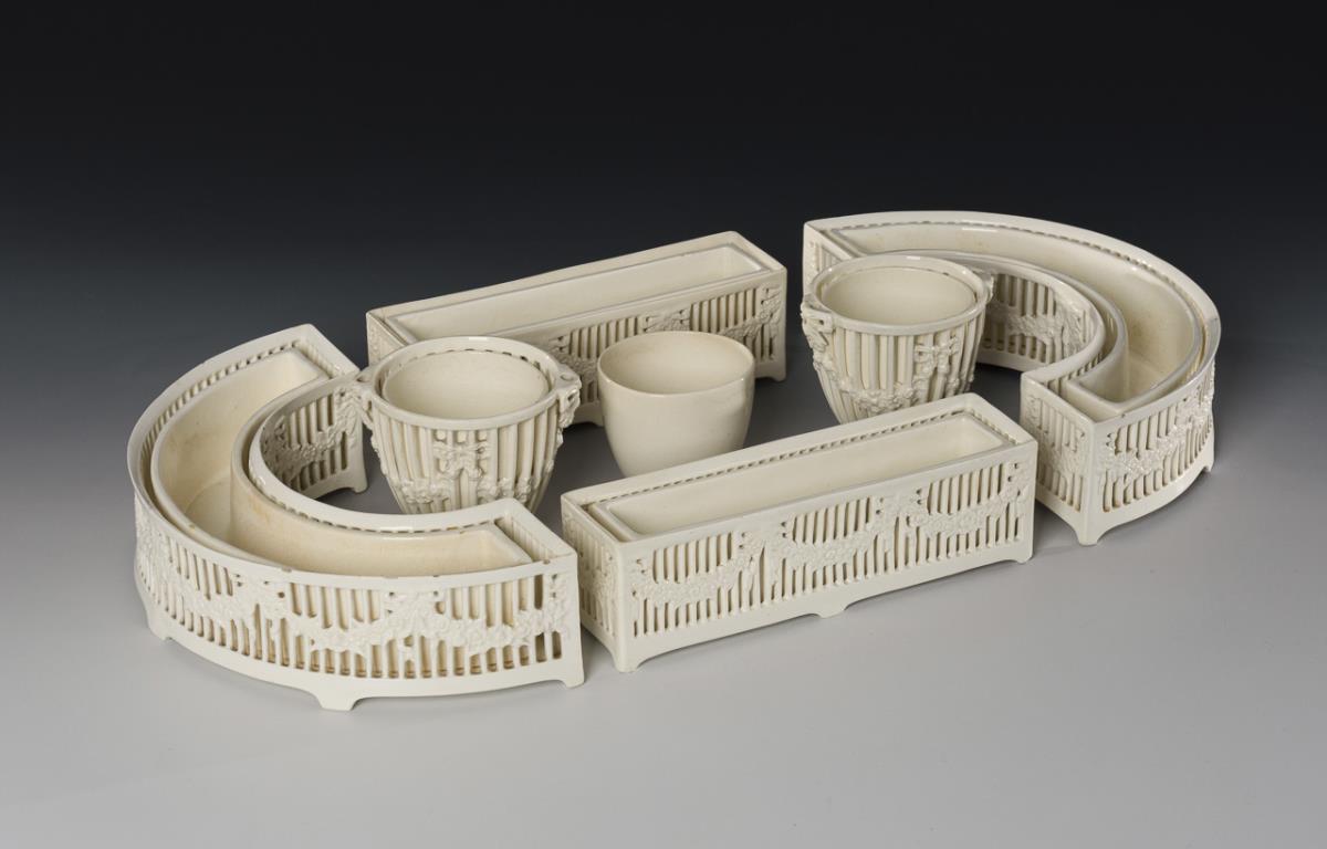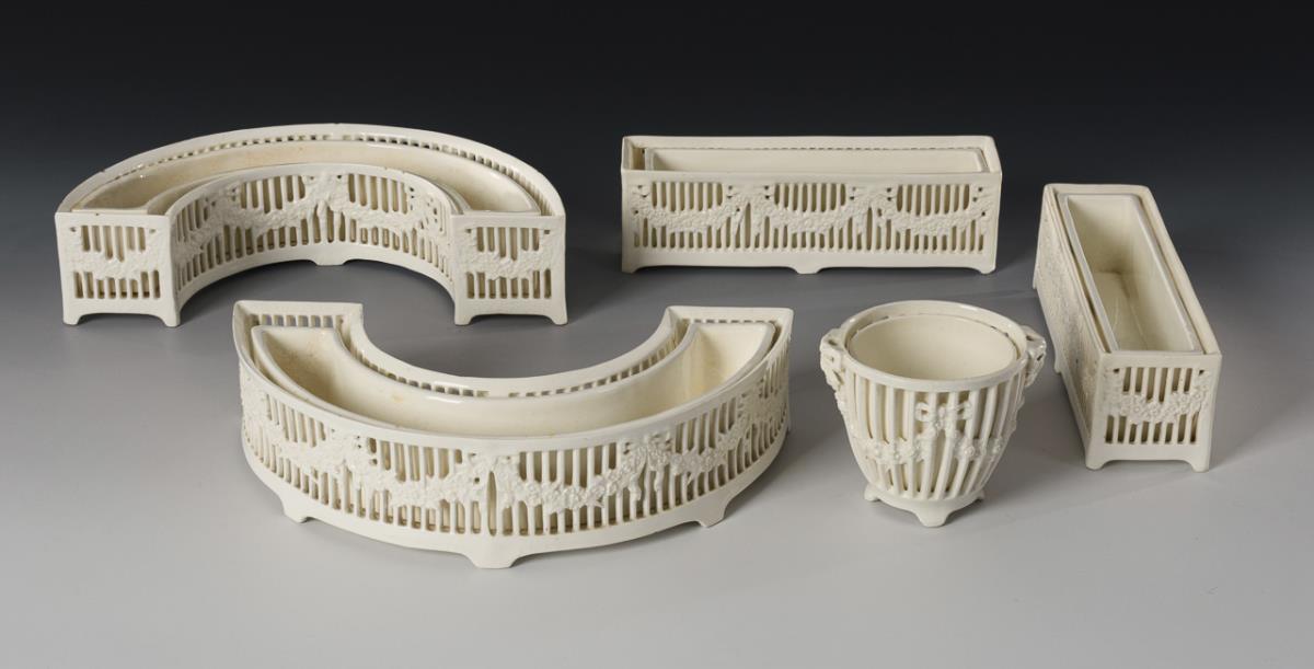 2 semicircular and 2 straight flower troughs with insert (L 20 cm, Ø approx. 25.5 cm), 2 baskets with inserts (H 8 cm), plus 1 loose insert. Rod-like openwork walls with festoon reliefs and bow decoration. The tubular handles of the baskets are missing, small defects in places.