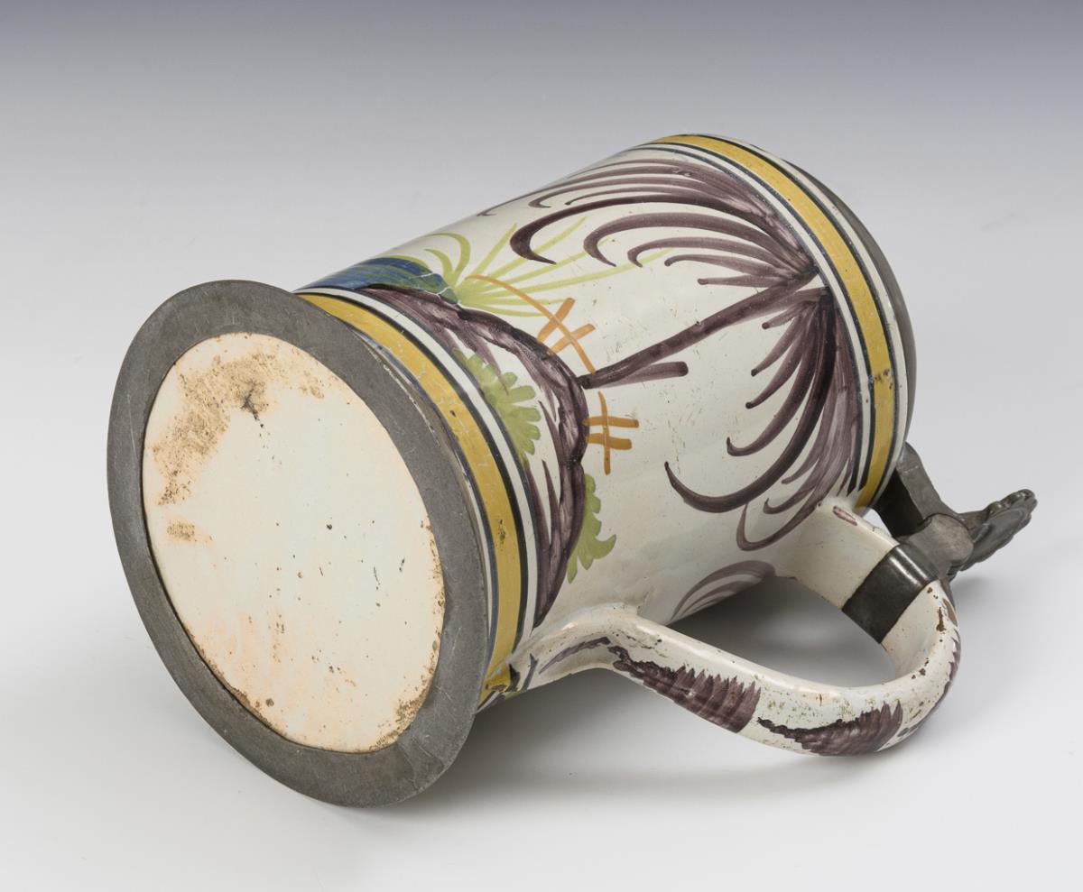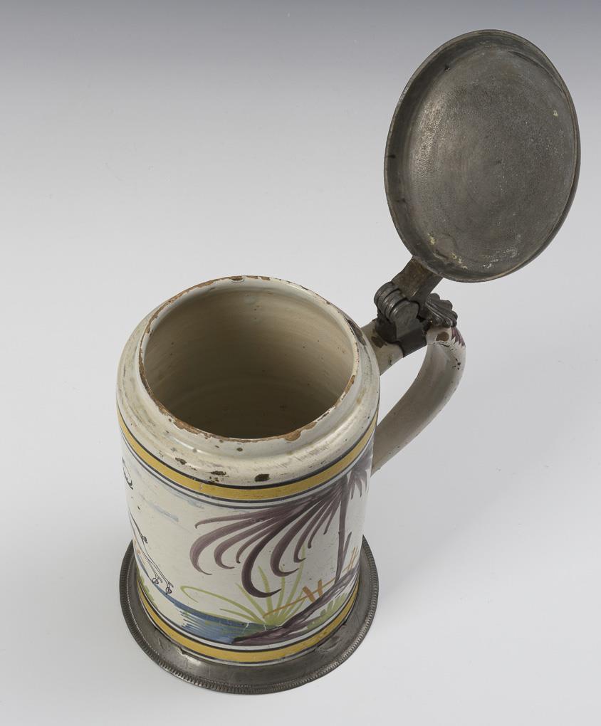 Cylindrical body with ribbon handle, the front with a leaping stag in a landscape with palm trees. Domed pewter lid with shell pusher, engraved "1833", pewter stand ring. Glaze defects and knocks, pewter with slight defects.