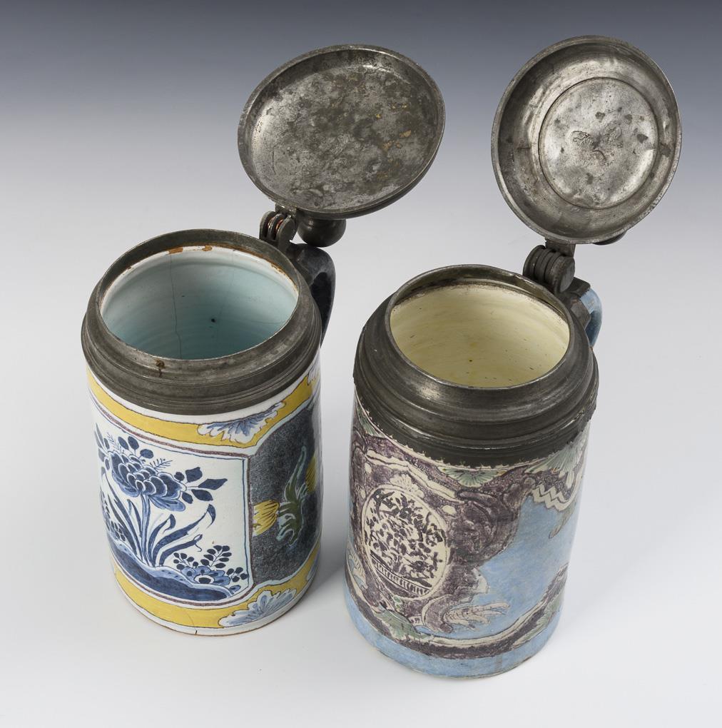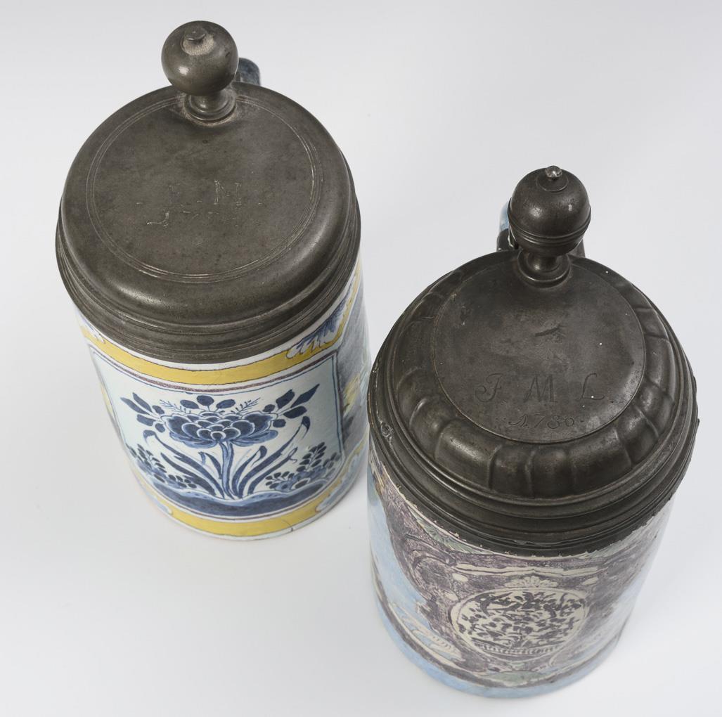 Each cylindrical body with strap handle, 1x pilaster decoration with floral painting, 1x blurred baroque reserve with floral motif. Each with pewter lid and ball finial, engraved "EM 1754" and "JML 1780". Each restored and with defects.