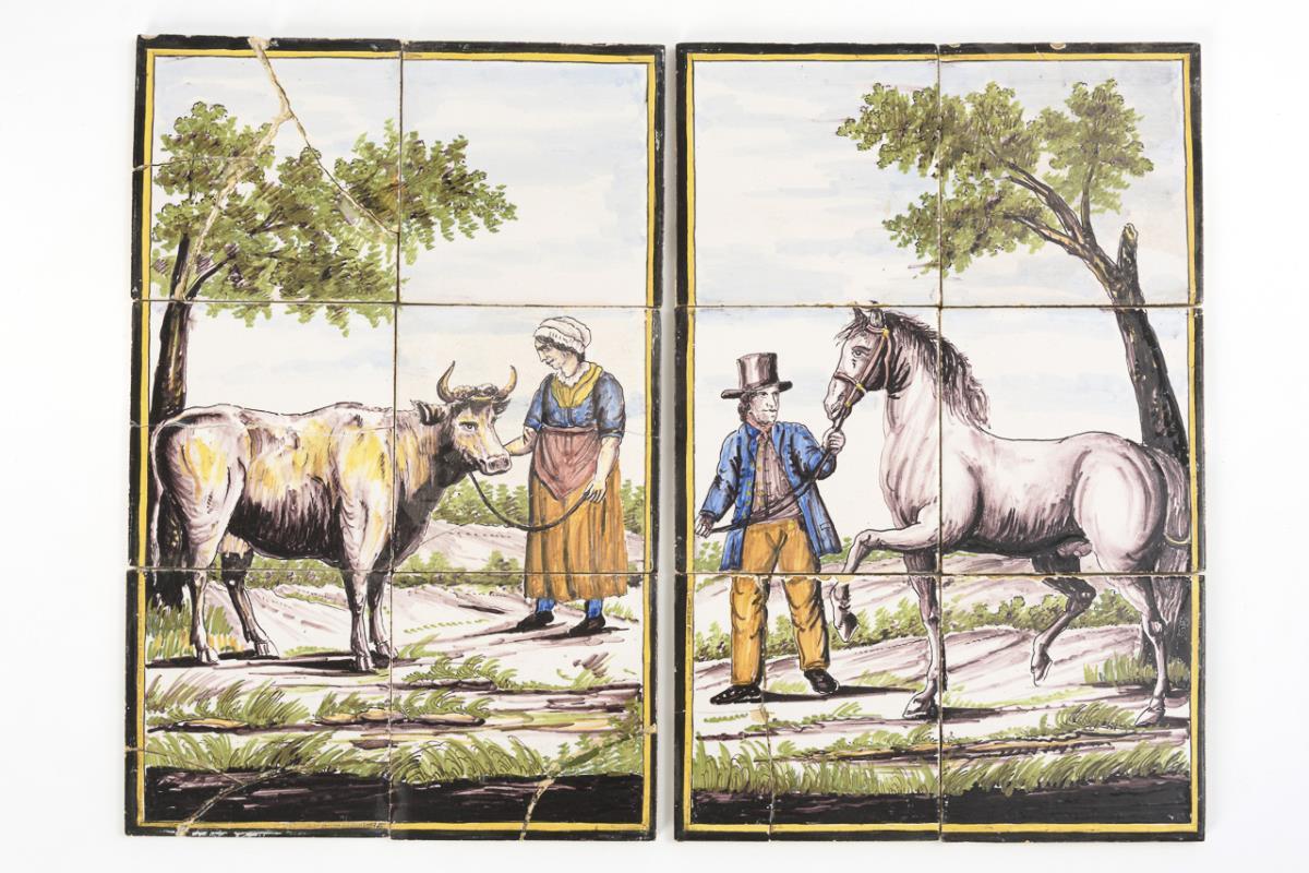 2 faience tile pictures: Farmer with horse, farmer's wife with ox.