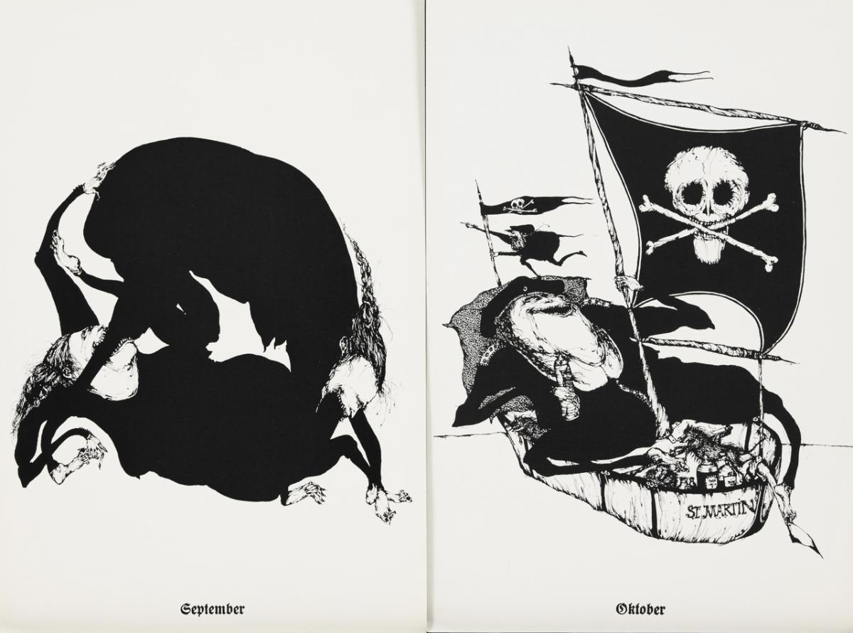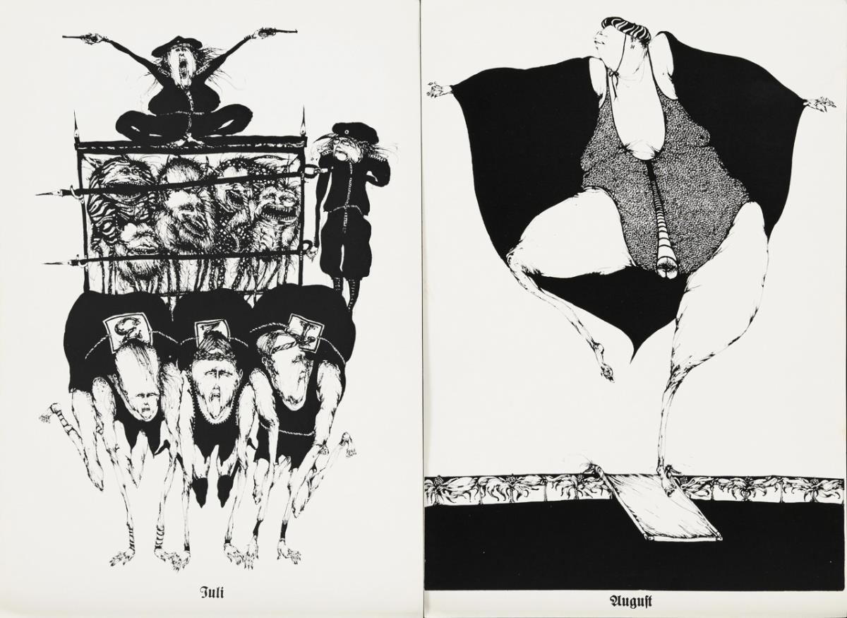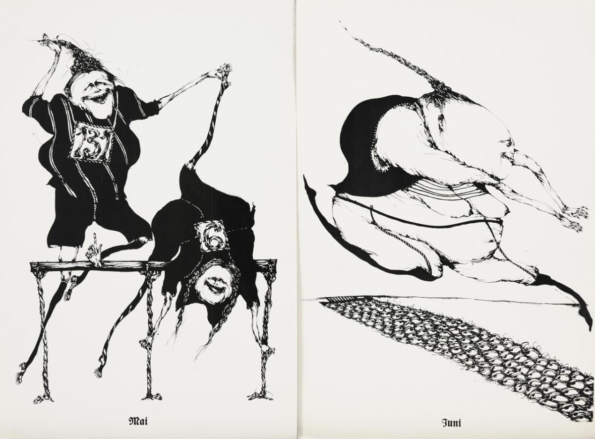 12 loose monthly sheets with whimsical figures playing sports; on the occasion of the 1972 Olympic Games in Munich. Corners minimally bumped.