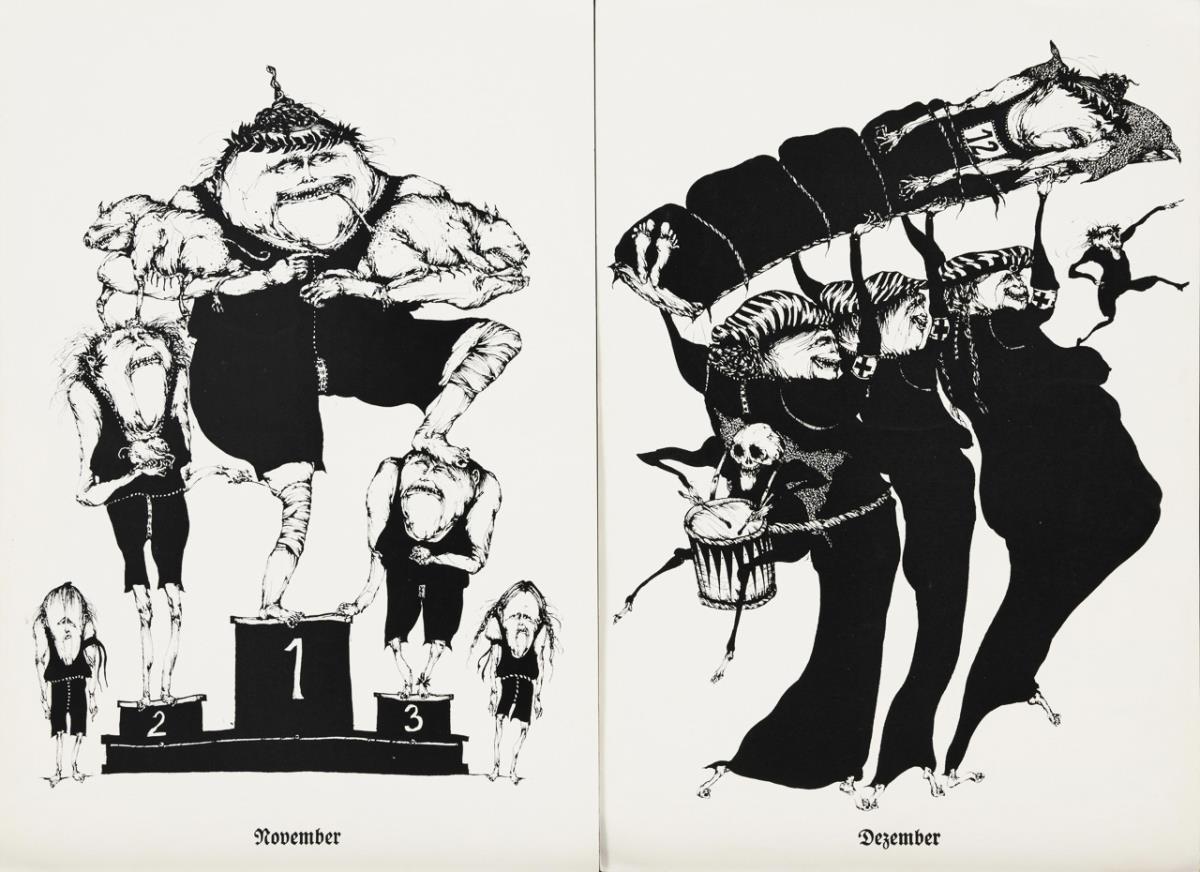 12 loose monthly sheets with whimsical figures playing sports; on the occasion of the 1972 Olympic Games in Munich. Corners minimally bumped.