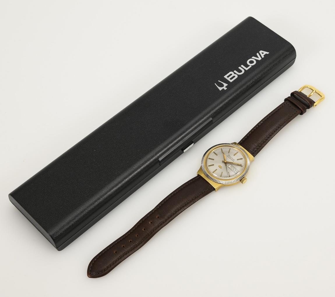 Round case with coin edge bezel. On the back with engraved dedication "Weihnachten 1974 KT". On a brown leather strap with pin buckle. Minimal signs of wear.