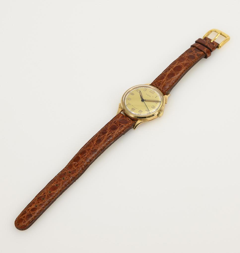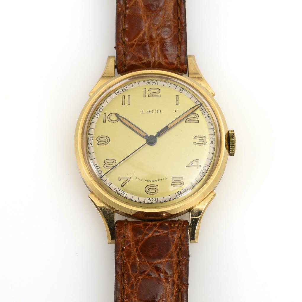 Spring movement with crown winding. Functional in short time test. Gold-colored dial with Arabic numerals, minute ring, central second and luminous hands (luminous material no longer active).