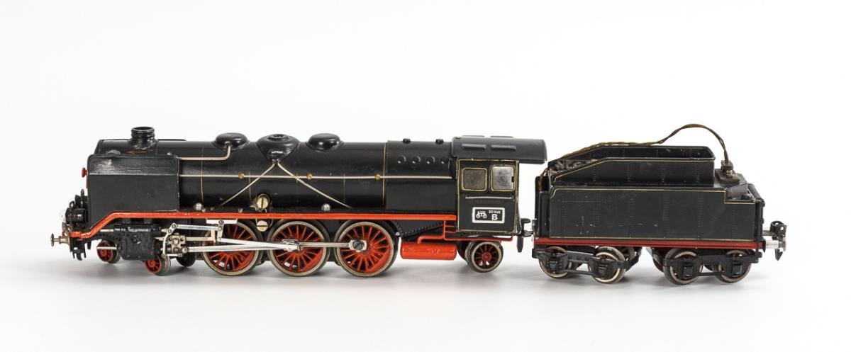 Electrically powered steam locomotive "HR 70/12920", 20 volts, 2-C-1 with matching tender "HR 929/0". Comes with original box and purchase receipt from 1958. With repairs, 2 wheels on the tender probably replaced.