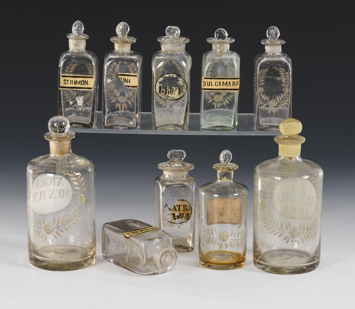 3 cylinder bottles (h 1x 13.5 cm and 2x 17.5 cm) and 6 +1 square bottles (h approx. 12.5 cm); all with chipping. Engraved and gilt leaf tendrils on the front, mostly with inscriptions. 1x without stoppers.
