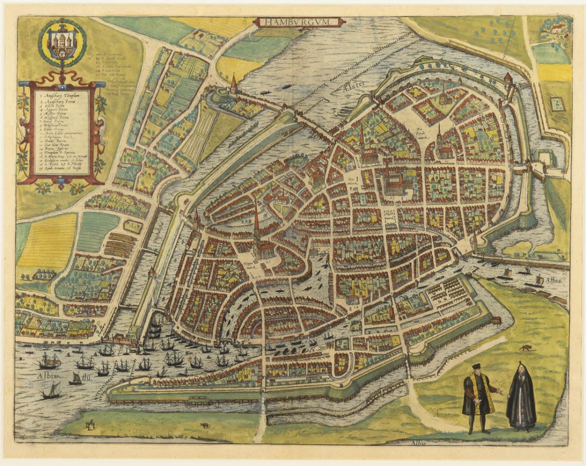 Plan of Hamburg "Hamburgum", with city coat of arms and legend, printing plate: 37.5 x 48 cm, framed & behind glass: 70 x 80 cm; from Braun and Hogenberg's "Civitatis Urbis Terrarum", 1588 - 1597 | Plan of Hamburg "A new Plan of Hambourg by Peter Martel Engineer 1746", with legend, printing plate: 30.5 x 45.5 cm, framed & behind glass: 54.5 x 69.5 cm | View of Hamburg from a central perspective, with title banner "Hamburch ein vorneliche Hansestat" and cartouche "Hamburga. Florentissimum inferioris [...]", 1572, printing plate: 16 x 47 cm, framed & behind glass: 39 x 70 cm, centerfold, somewhat rubbed; from Braun and Hogenberg's "Civitatis Urbis Terrarum", 1588 - 1597.