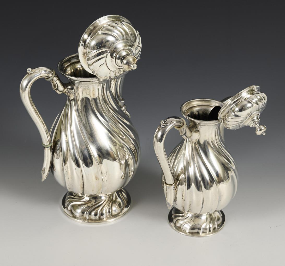 Elegant, bulbous baroque shape: coffee pot (h 29 cm), mocha pot (h 23 cm) and cream jug (h 11 cm). Minimally dented, 1 handle slightly loosened.