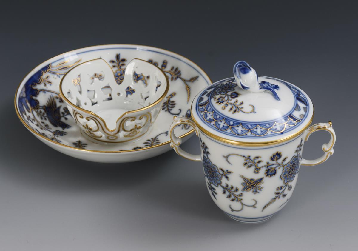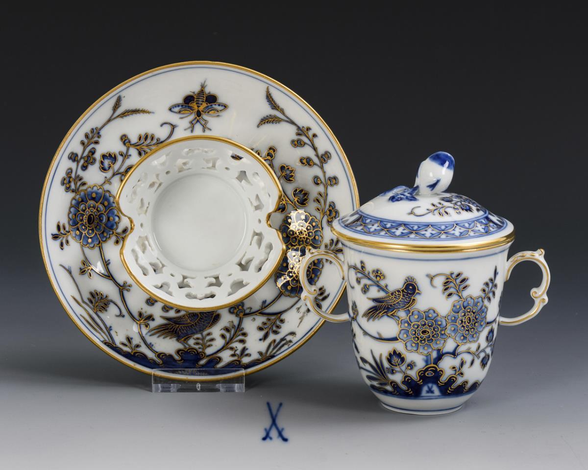Underglaze blue painting, gold decoration. Cup (h 7.5 cm), saucer (Ø 14 cm).